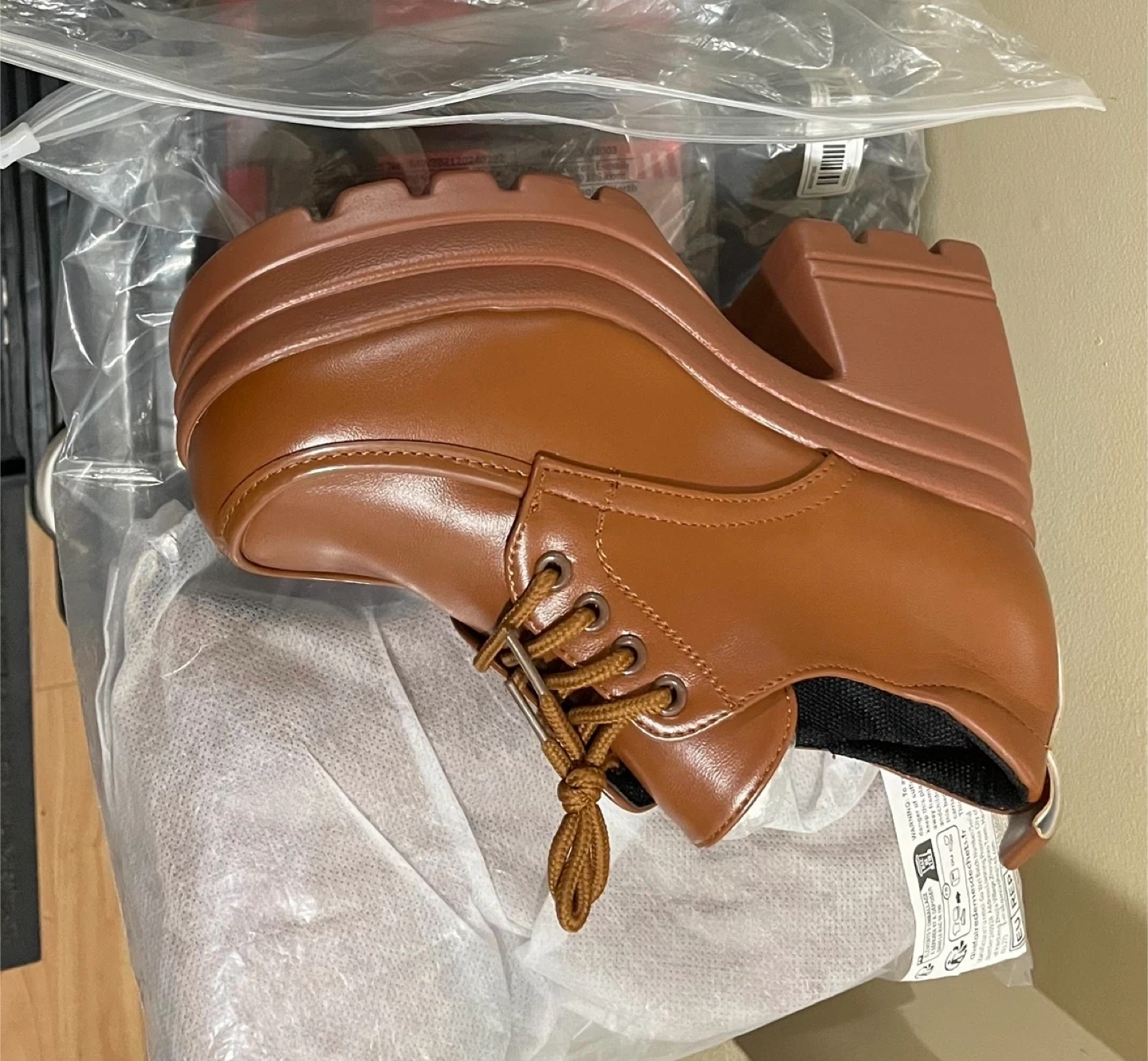 Women’s size 7.5, brown platform oxford shoes feature a classic lace-up design. They have a stacked heel and a thick sole, perfect for adding some height. Faux leather material.