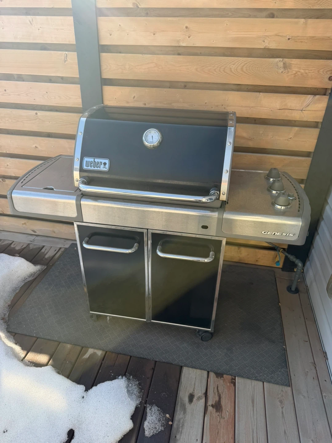 Weber Genesis gas BBQ grill. Stainless steel construction with side shelves and storage cabinet. Perfect for backyard cooking during the warmer months!