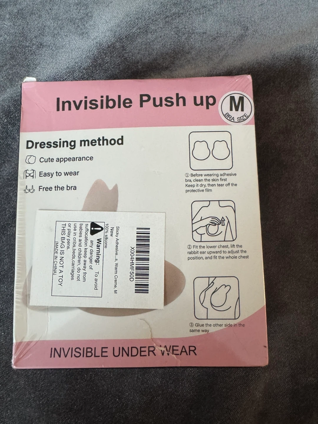 Brand new invisible push up bra in size M. It's self-adhesive and has an enhanced, thin design. The contents are 100% silicone, which is healthy and environmentally biological glue. It's water-resistant, skid-resistant, and provides invisible lifting that lasts without fear of losing. The box is included!