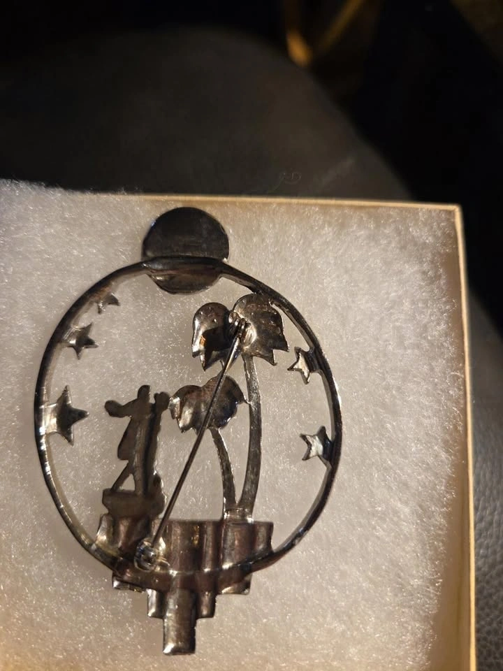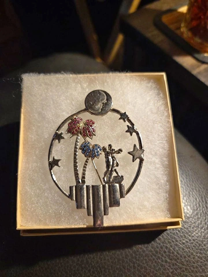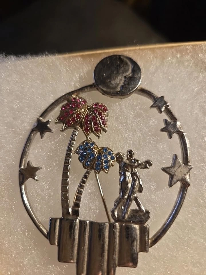 This vintage Art Deco style 'Dancing Under The Palms' brooch is a beautifully crafted piece of jewelry featuring a silver tone with blue and red accents. The intricate design captures dancers under palm trees, making it a unique and eye-catching accessory. The combination of silver and vibrant red stones adds elegance and whimsy to any outfit. It's a versatile and stylish piece for vintage jewelry lovers. I've only seen one other like this.
