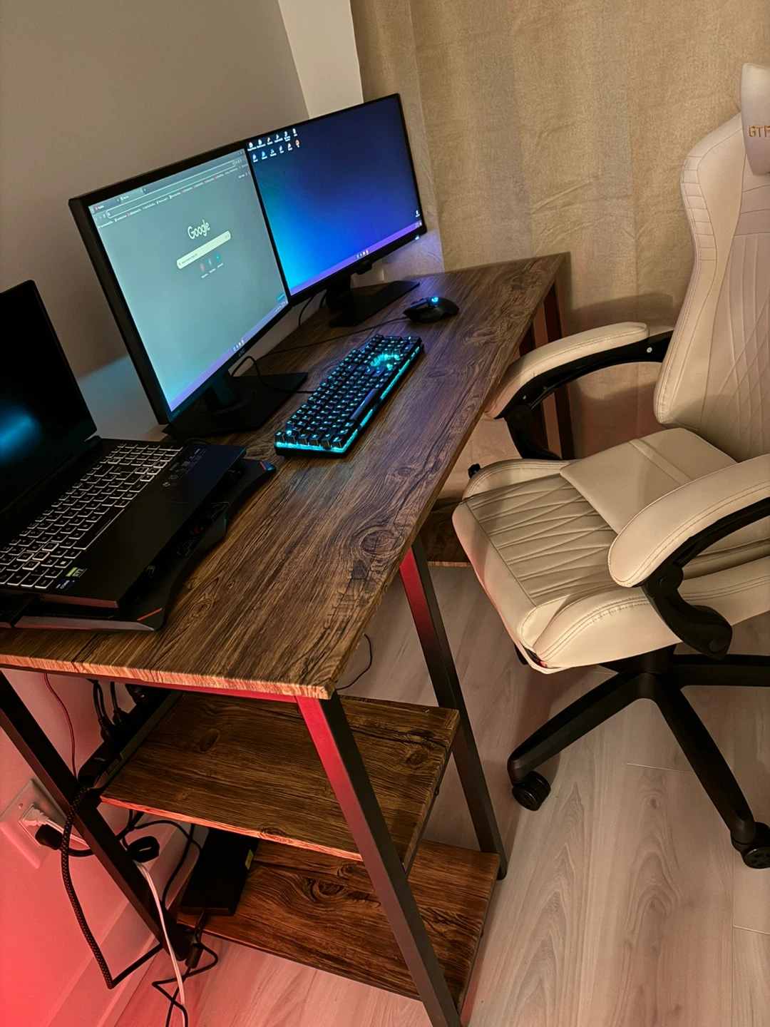 Desk is originally black. Wrapped it with the wood wrapping paper, comes with gaming chair with speakers integrated. Perfect for a gaming setup or home office!