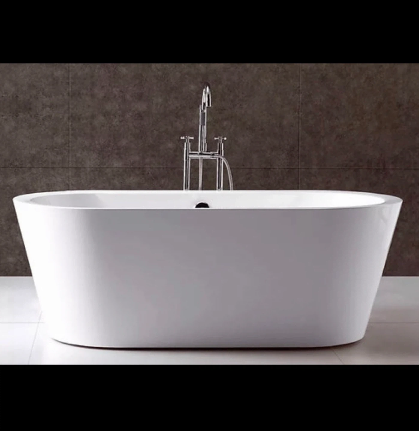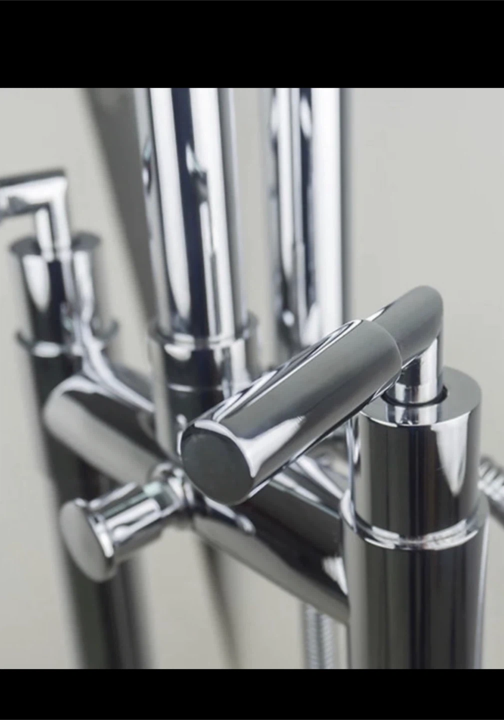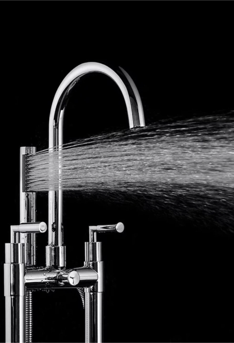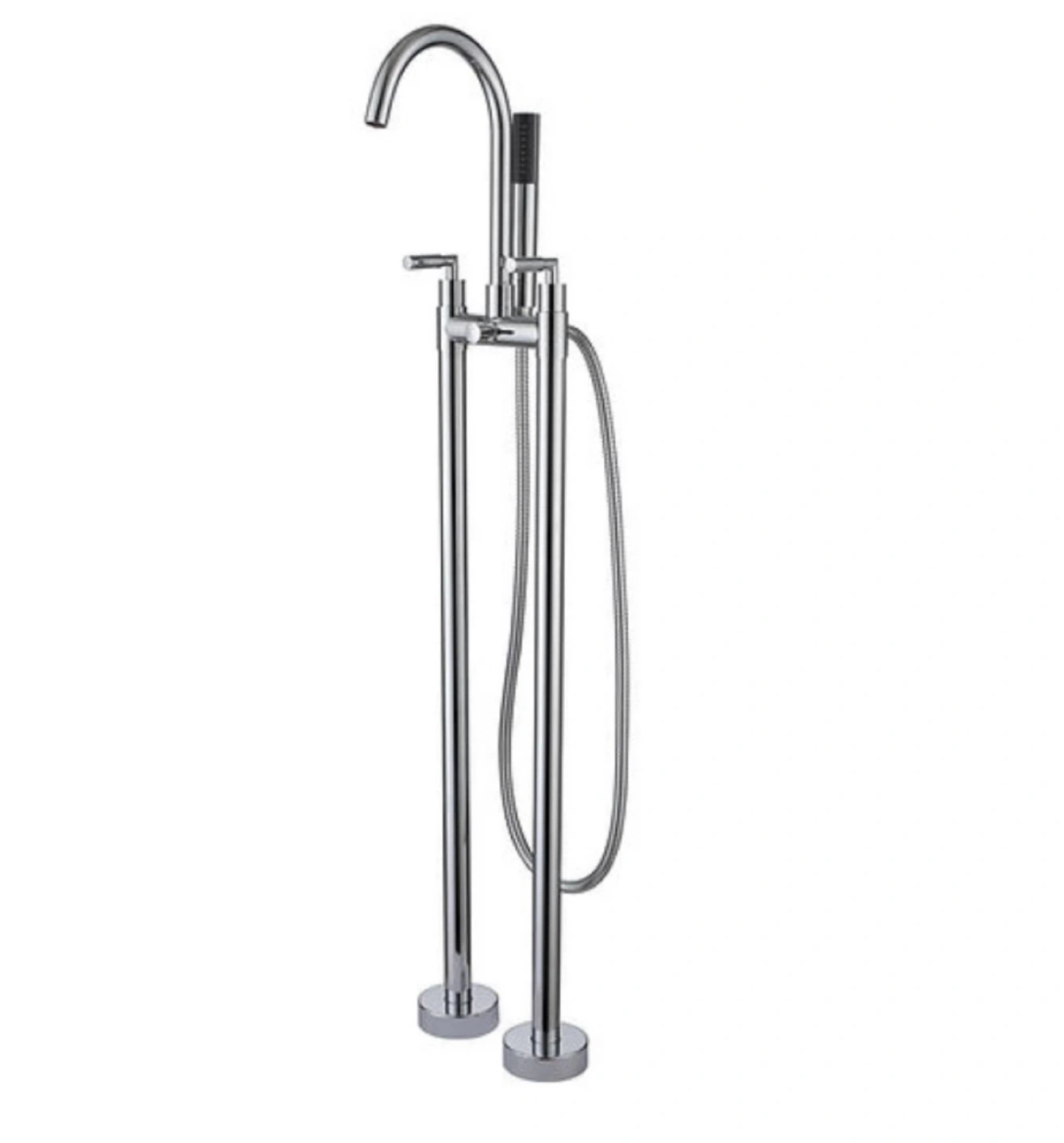 This freestanding bathtub faucet features a sleek, modern design in a chrome finish. It includes a handheld shower for added convenience. The faucet is made of durable metal and has dual knobs for temperature control.