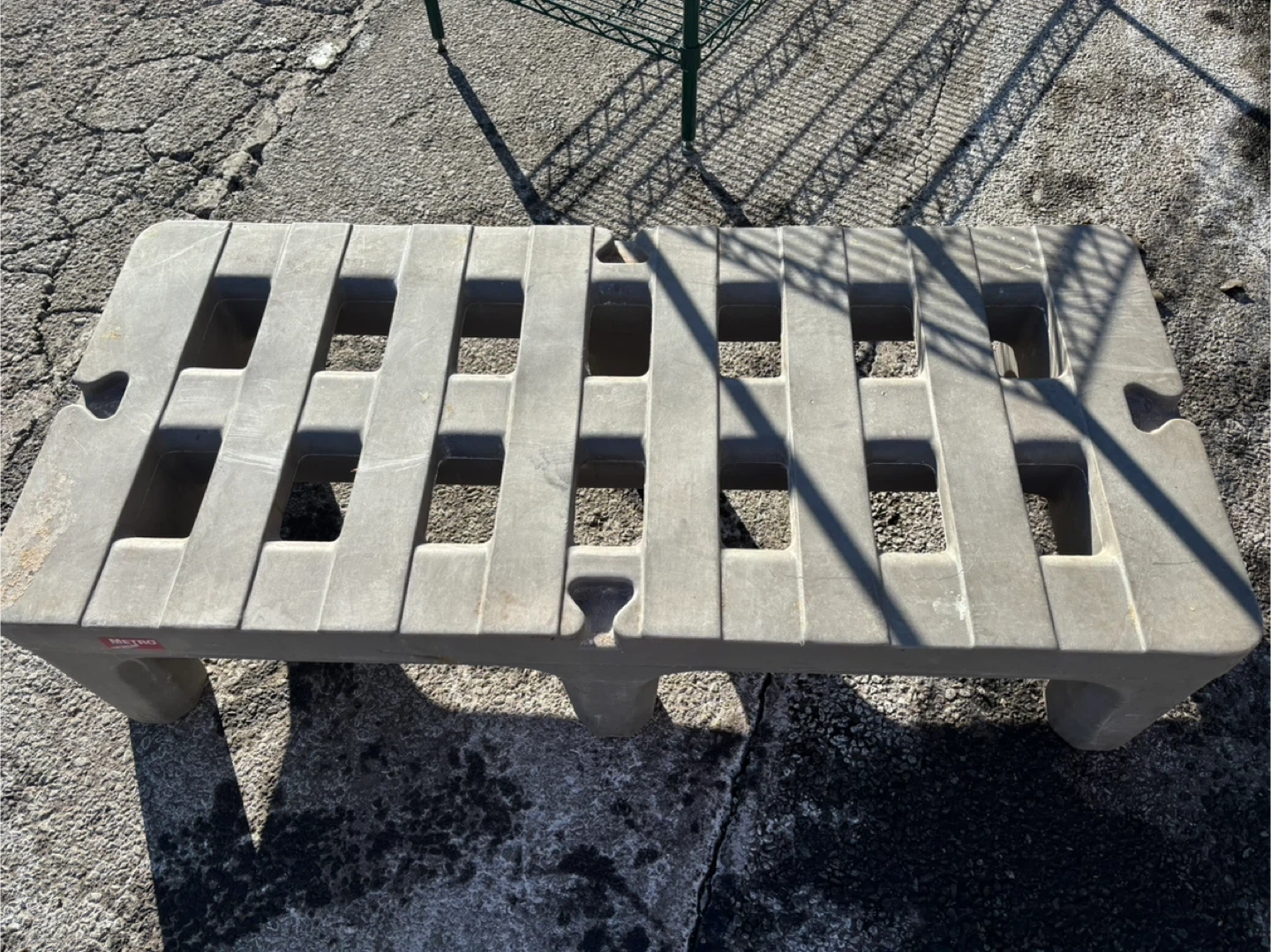 This is a set of gray plastic pallet risers. They're designed to elevate pallets for better airflow and access. Made of durable plastic.