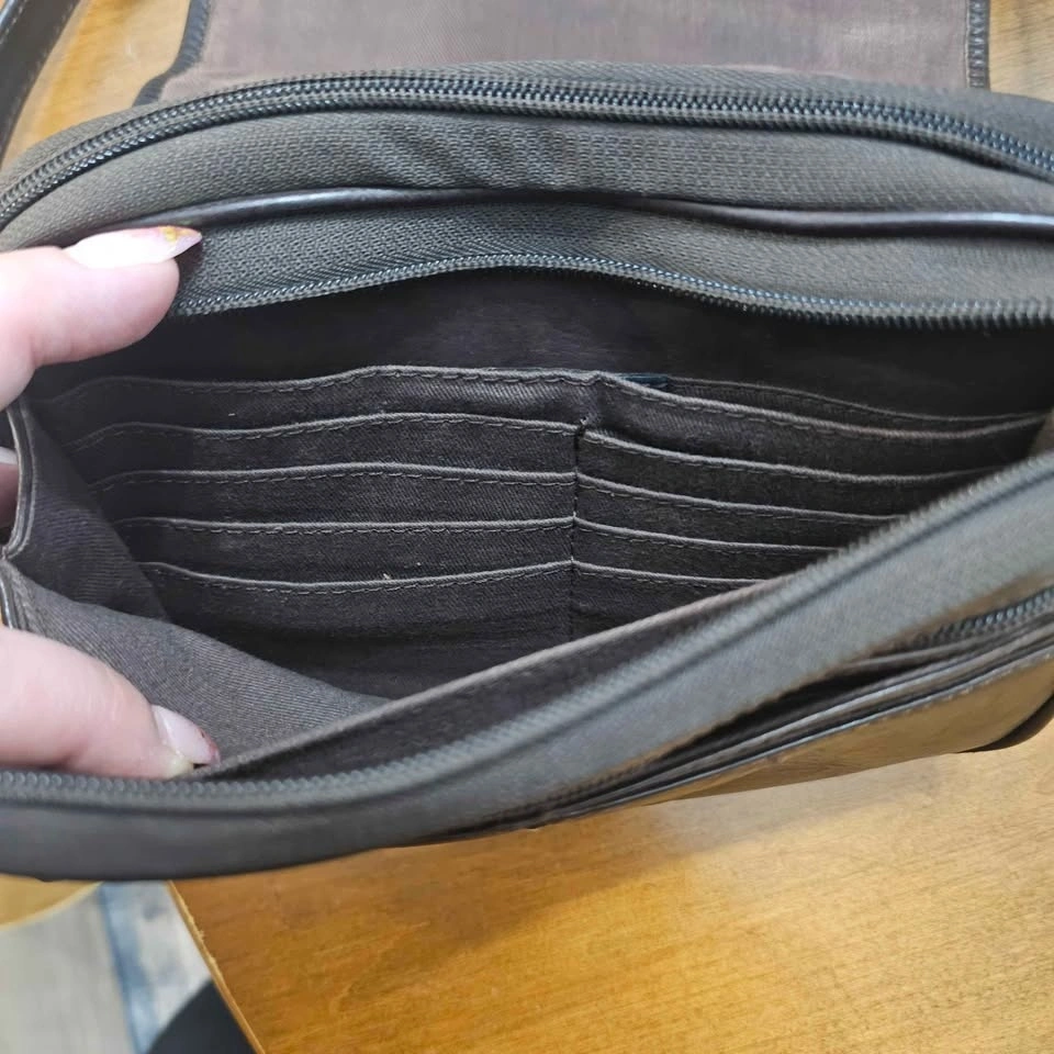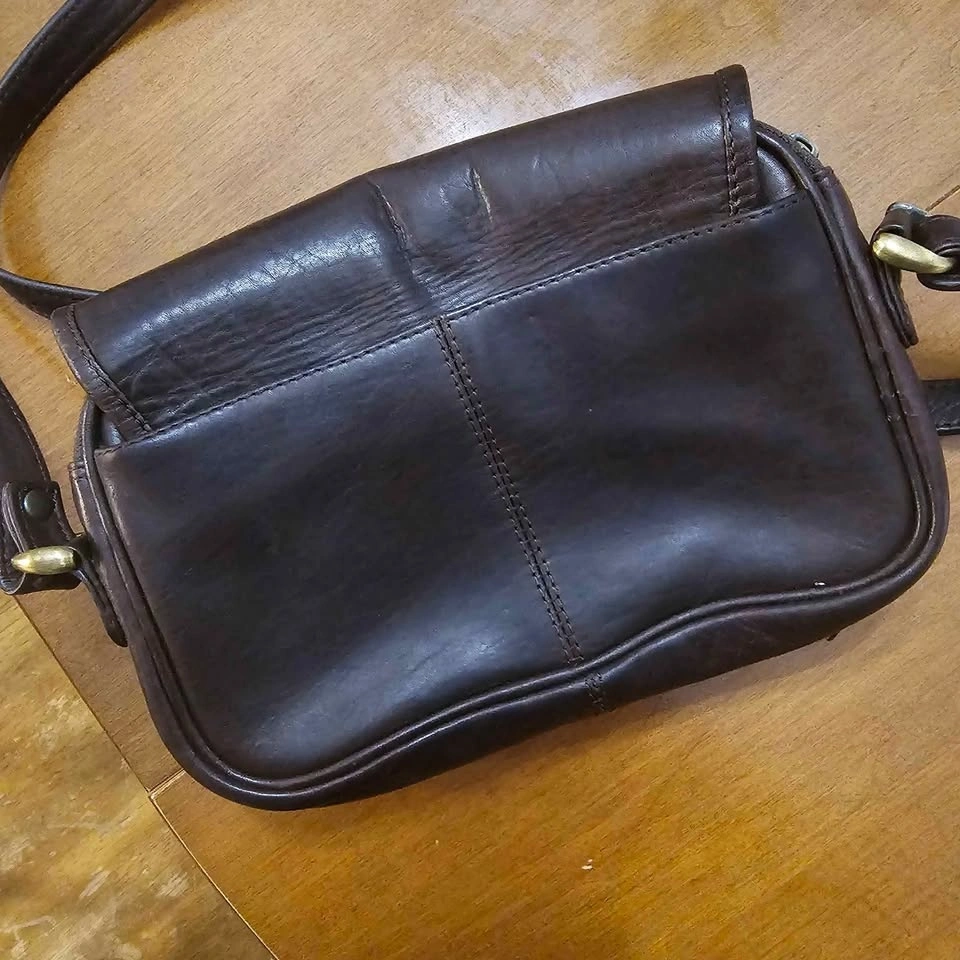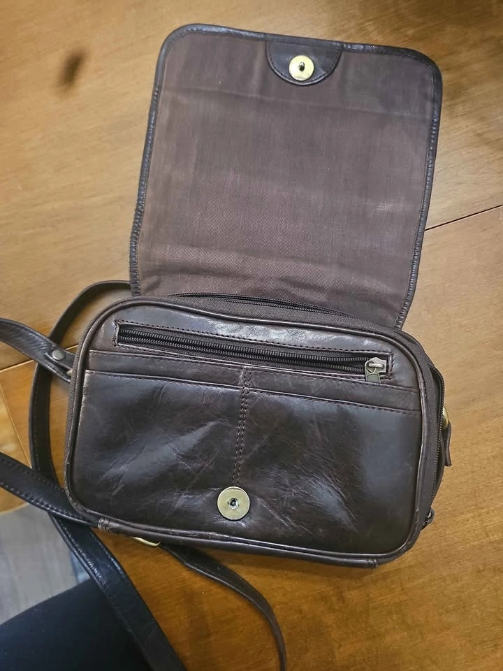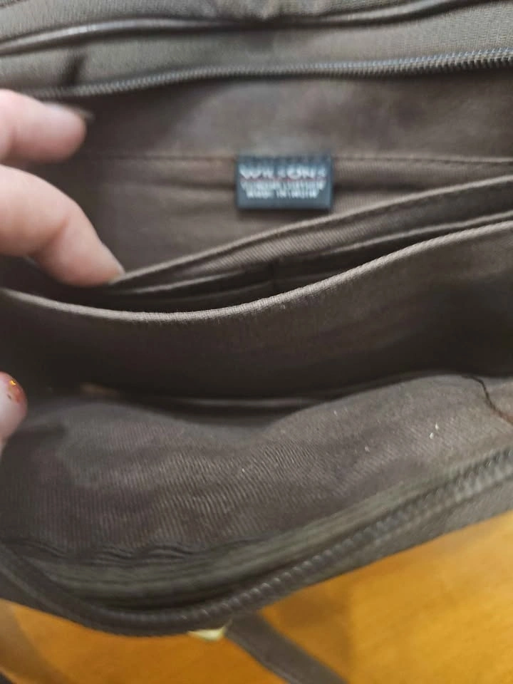 Wilson’s genuine leather crossbody bag in rich dark brown. Soft genuine leather. Features: Adjustable leather strap, front snap pocket, interior zip pocket, top zip closure, card slots. Lightweight everyday size. Good used condition with normal wear consistent with leather. All zippers and snap closures work properly. Comfortable worn crossbody or on the shoulder. Pick up Langley 208 & 57. Non smoking home.