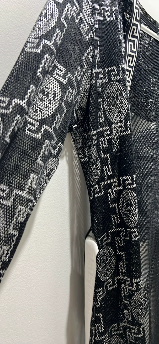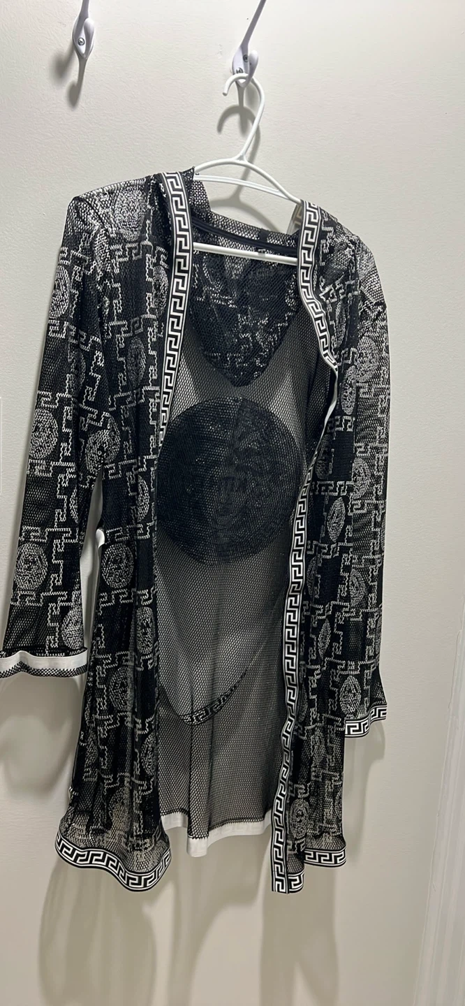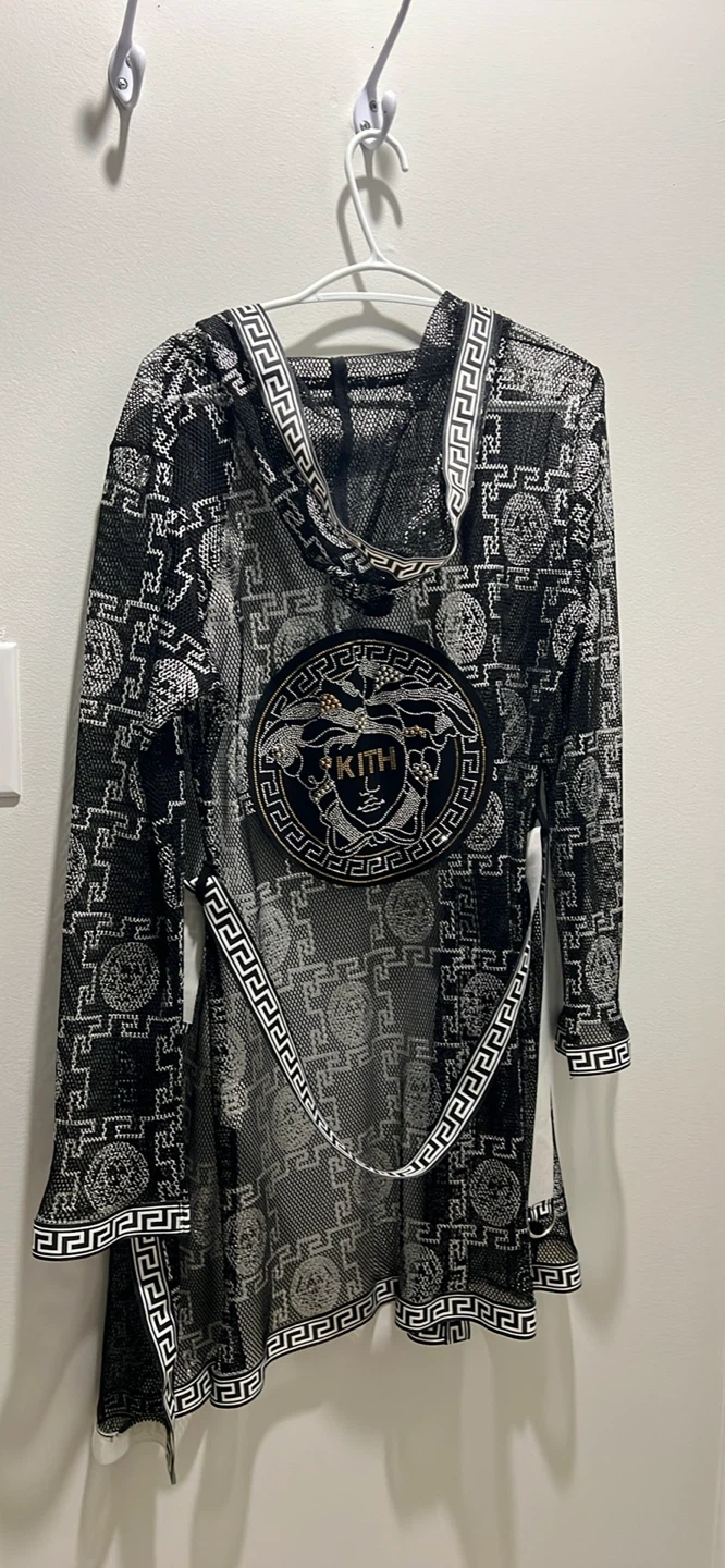 This is a KITH hooded cover-up in black mesh with a Greek key and Medusa head print. It features a tie belt and ribbed cuffs and hem. Sheer material.