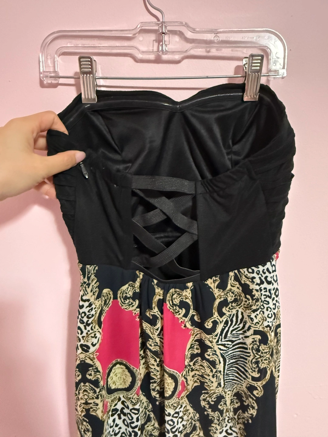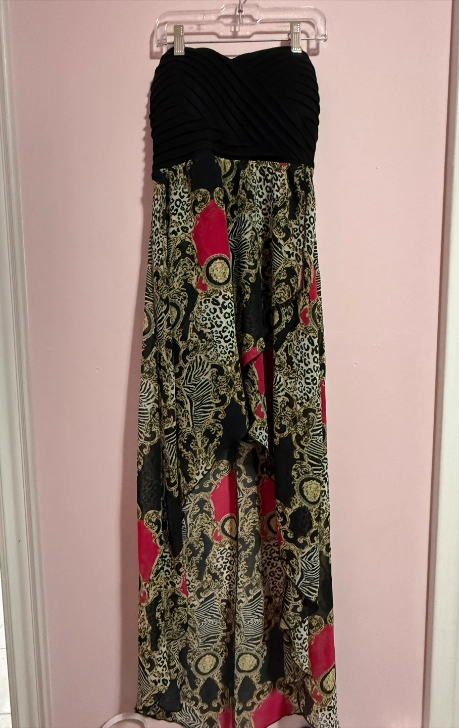 Selling a strapless dress with a black top and a patterned bottom. The dress has a unique design with a high-low hemline. It's in great condition and perfect for a special occasion or a night out.