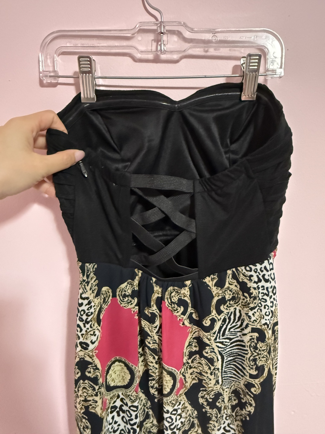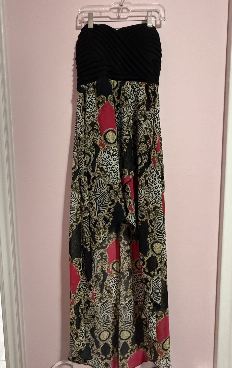 Selling a strapless dress with a black top and a patterned bottom. The dress has a unique design with a high-low hemline. It's in great condition and perfect for a special occasion or a night out.