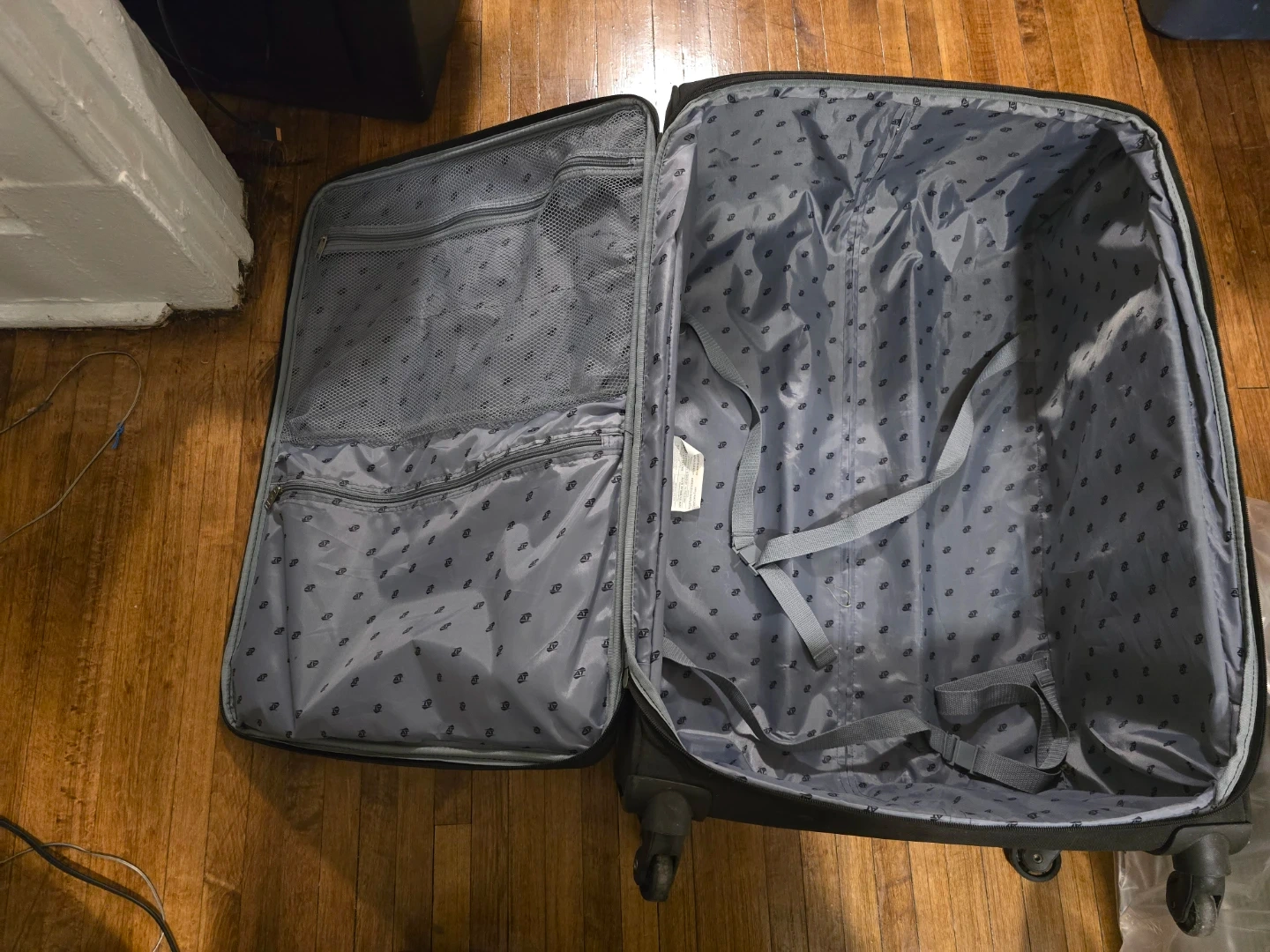 This is a black American Tourister rolling suitcase. It features a spacious interior with tie-down straps and zippered compartments. The exterior has multiple zippered pockets for easy access.