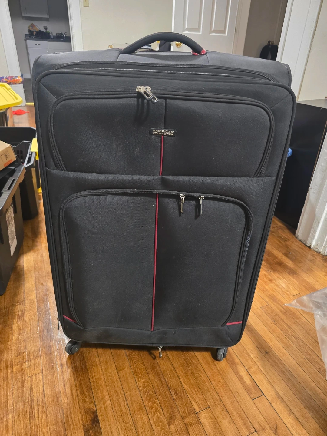 This is a black American Tourister rolling suitcase. It features a spacious interior with tie-down straps and zippered compartments. The exterior has multiple zippered pockets for easy access.