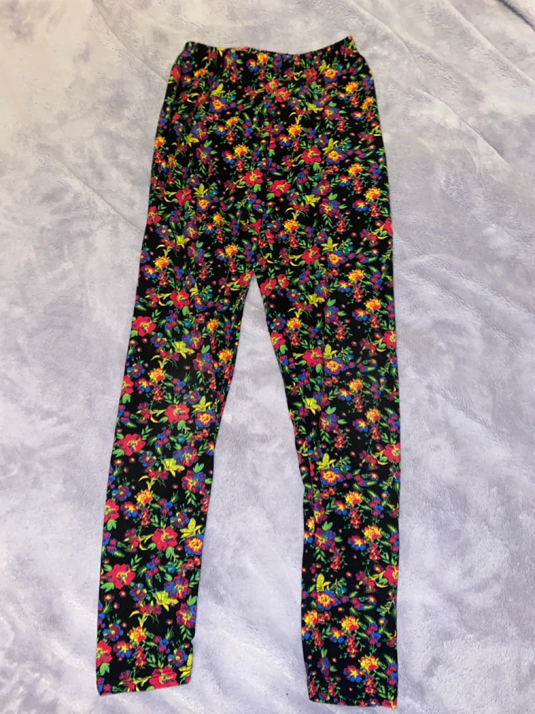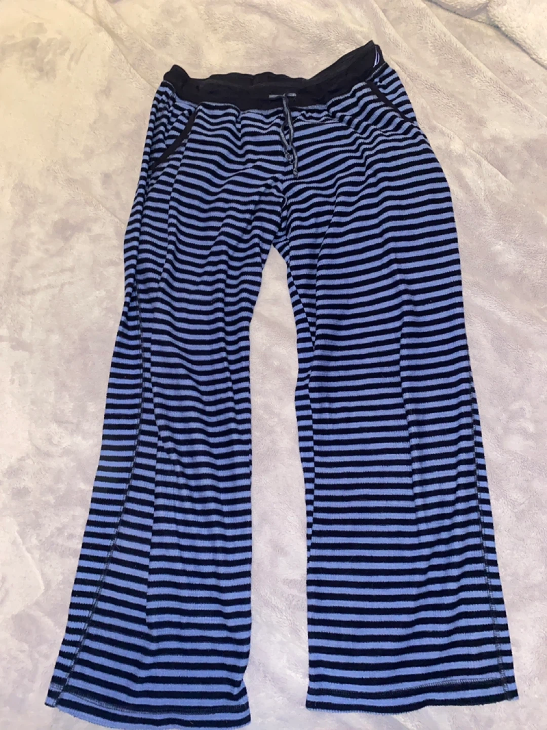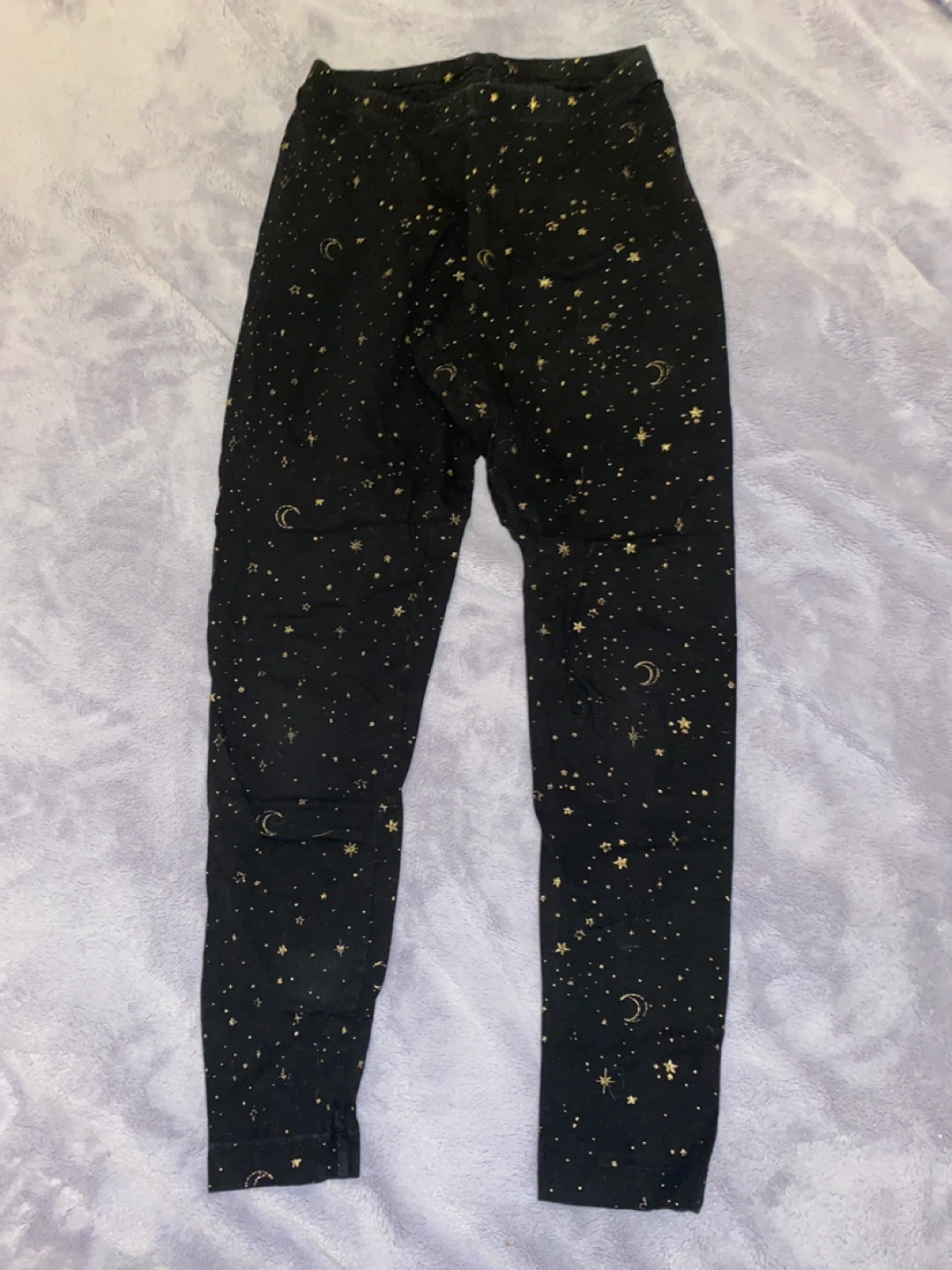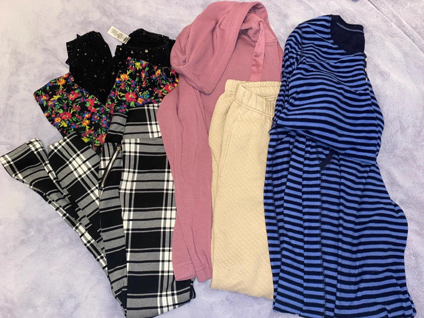 Bundle includes 5 pairs of pants. One pair has a black and gold celestial pattern. Another has a vibrant floral print on black. There's a black and white plaid pair with zippered pockets. A quilted tan pair of joggers. And a pair of blue and black striped pyjama pants with the top and a comfy hoodie.
