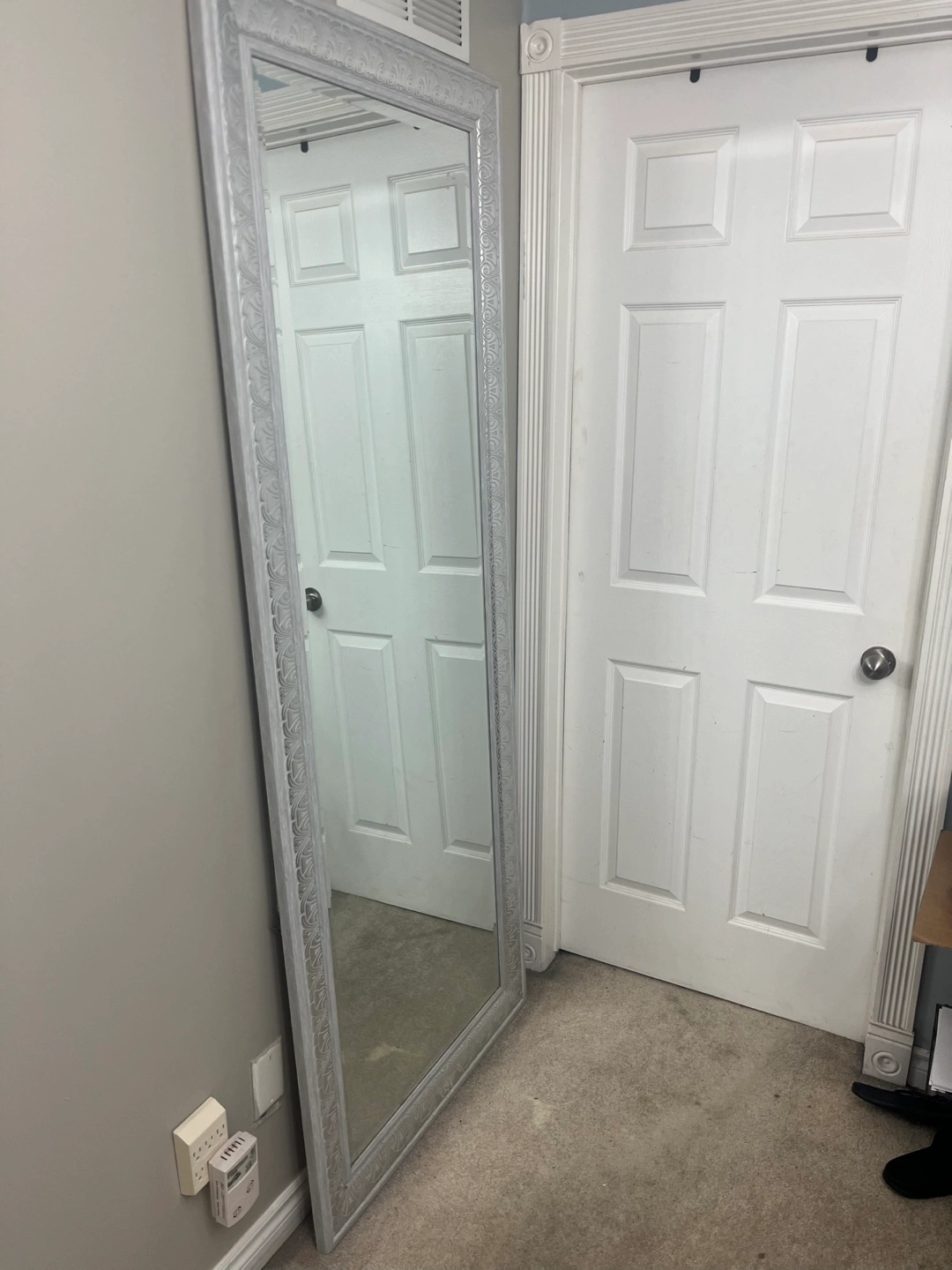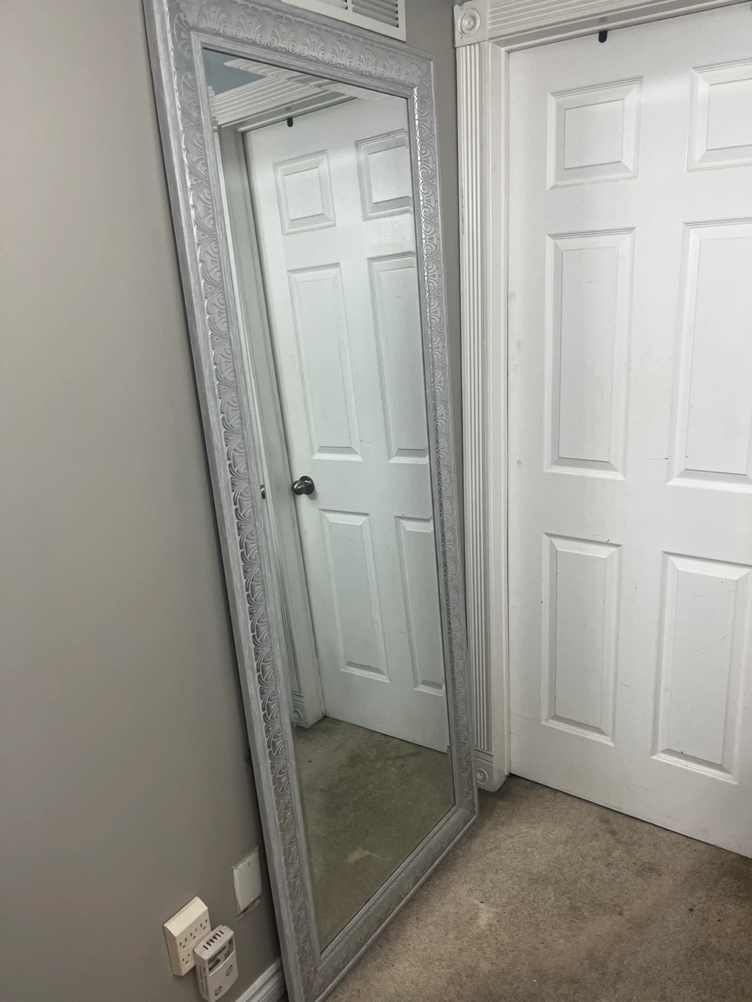 Tall silver mirror. Features an ornate frame. Great for a bedroom or hallway. Floor-length reflection.
