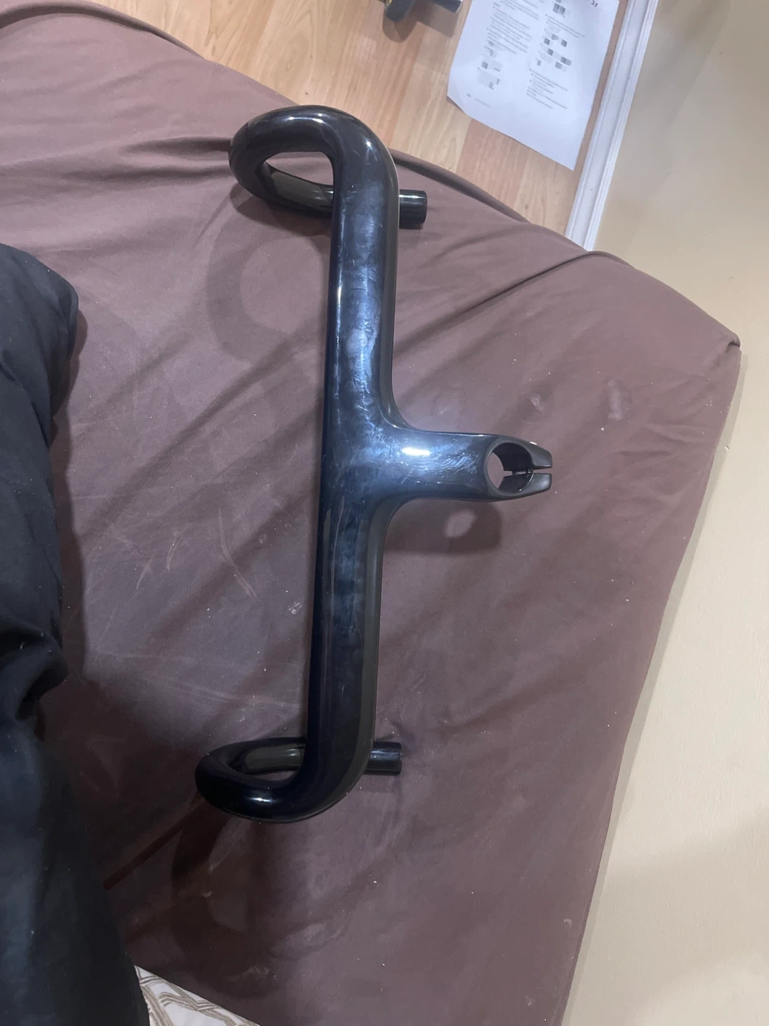 This is a set of black carbon fiber bicycle handlebars. They are a lightweight and durable option for cycling. These handlebars are designed for road bikes.