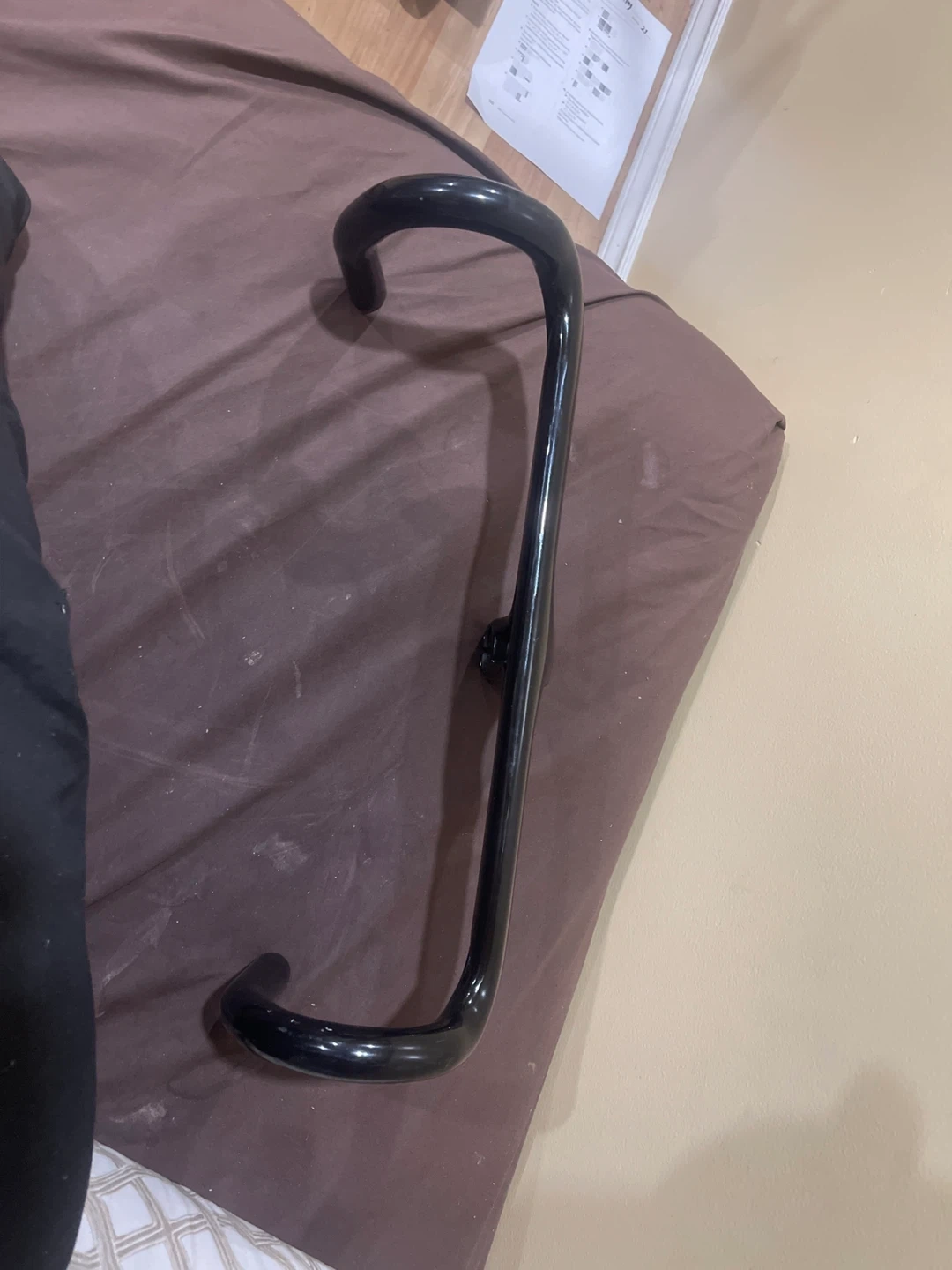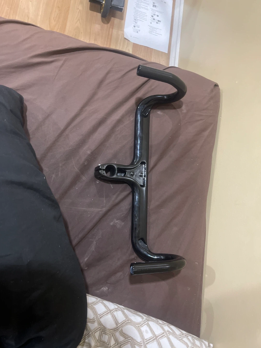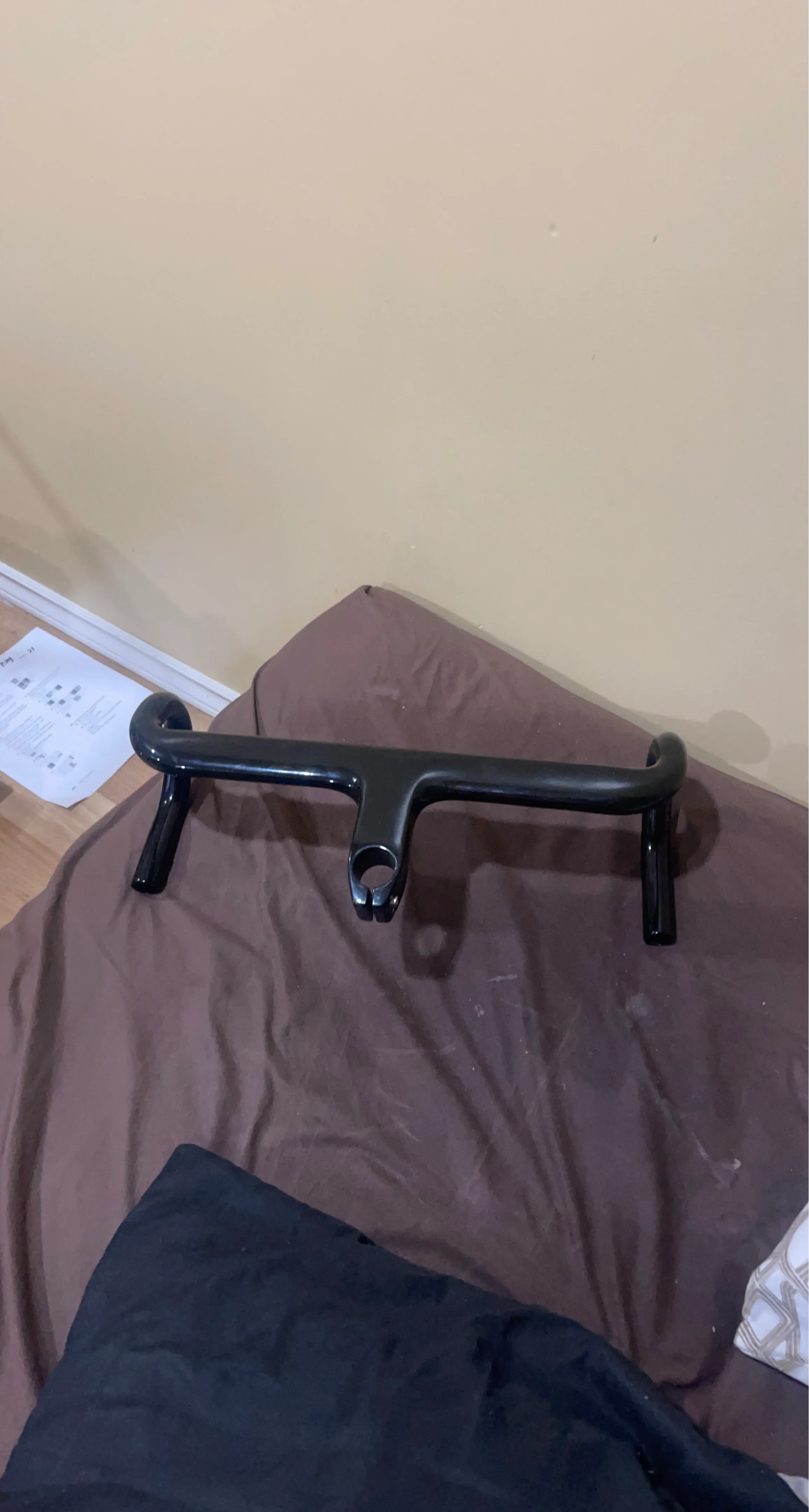 This is a set of black carbon fiber bicycle handlebars. They are a lightweight and durable option for cycling. These handlebars are designed for road bikes.