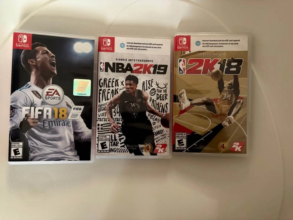 Awesome Nintendo Switch console bundle. Includes the console, blue and red Joy-Cons, the dock, power adapter, and Joy-Con grip and straps. Also has two steering wheel accessories (blue and red) for racing games. Comes with one of three games: FIFA 18, NBA 2K19, or NBA 2K18. Everything you need to start playing! Also comes with a free travel bag. Normal wear and minor scratches from use. Cash only, pick up in Markham at 16th Ave and 9th Line.
