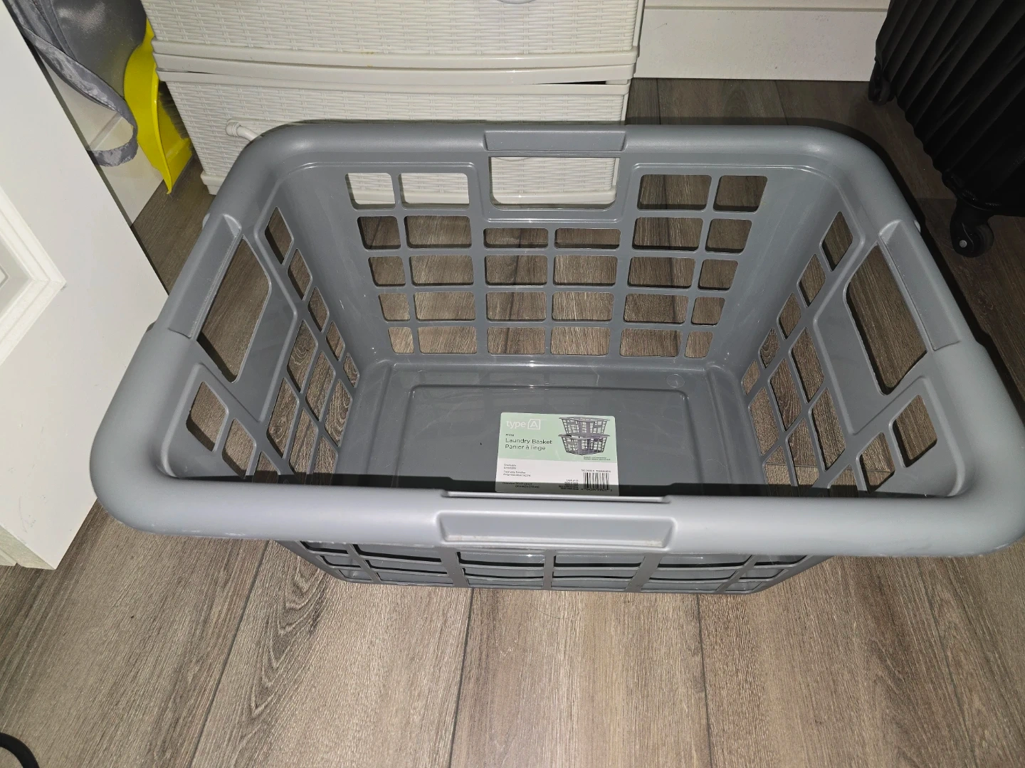 This grey Sterilite laundry basket is made of plastic and has sturdy handles. It's perfect for carrying laundry to and from your machine. It's a standard size for holding clothes.
