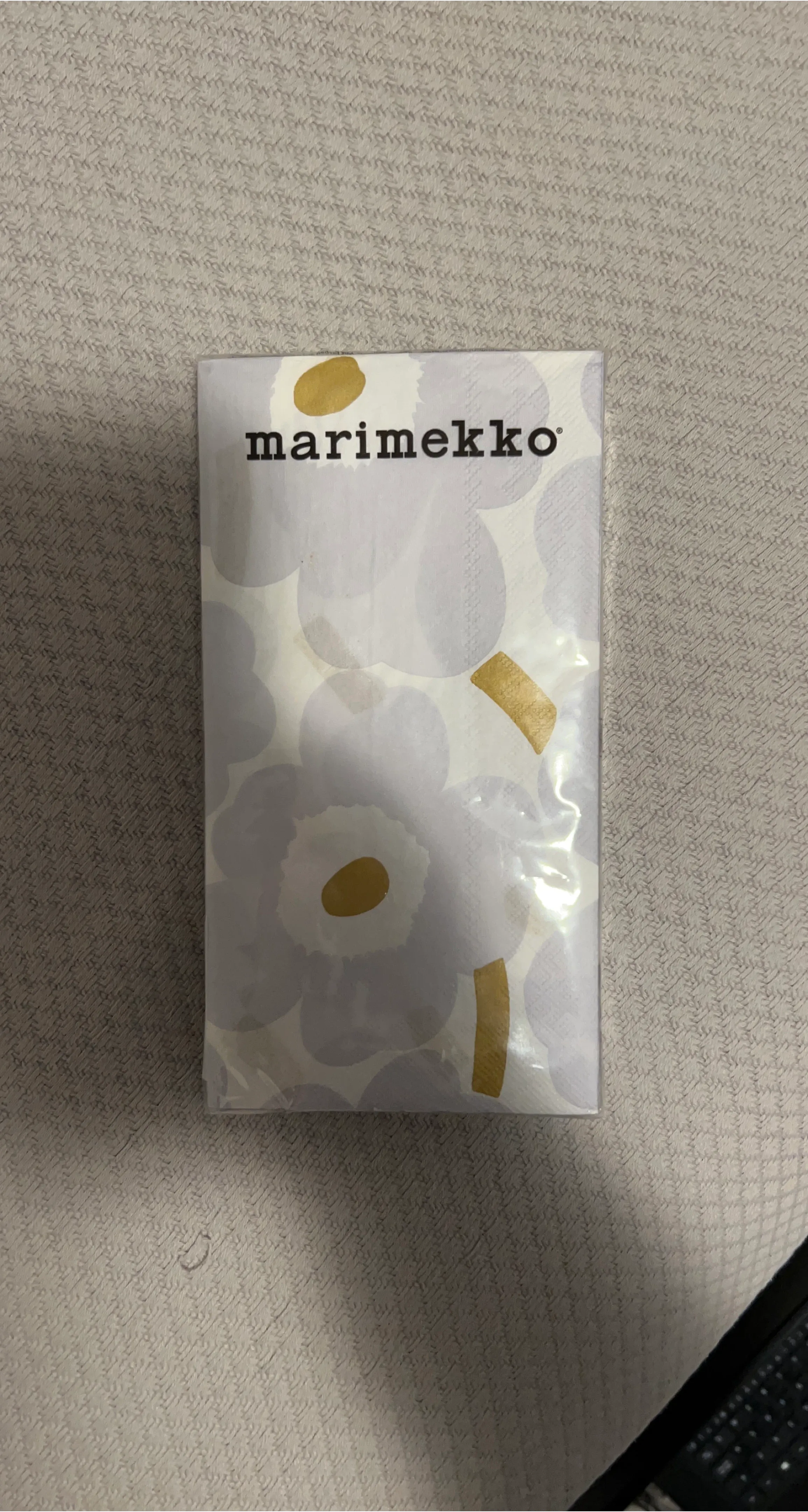 A set of Marimekko Siirtolapuutarha napkins. Featuring the iconic floral pattern with grey and gold accents. Perfect for adding a touch of Finnish design to your table settings!