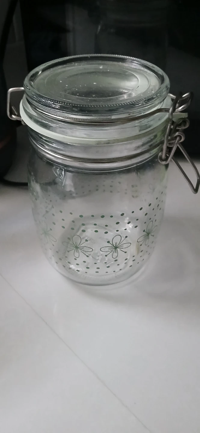 Glass storage jar with a white silicone seal and a metal clamp lid. It features a decorative pattern of green polka dots and small flowers. This jar is great for storing dry goods or as a decorative piece.