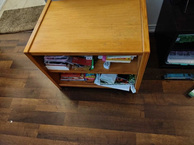 This used wooden bookcase features three shelves, perfect for storing books or displaying items. It's a sturdy piece that could use a little polish but is still fully functional. Cash accepted.