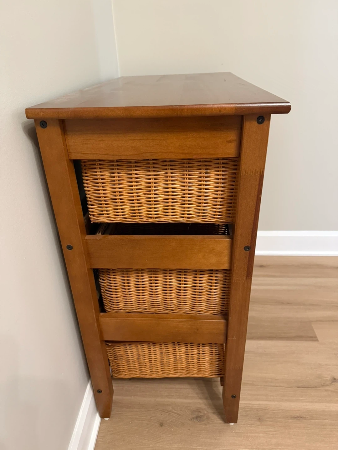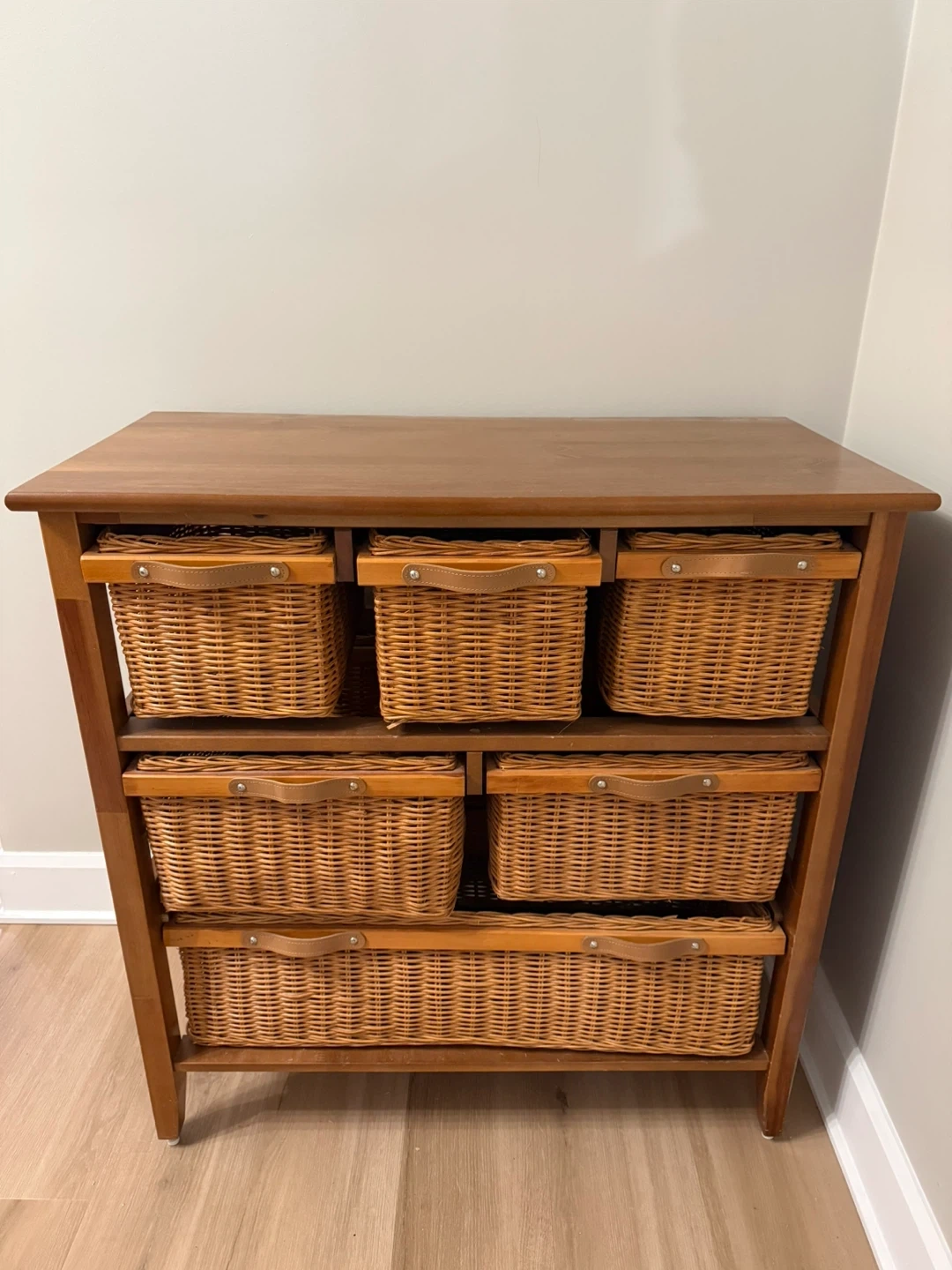This is a lovely wooden storage cabinet with six wicker baskets. It's great for organizing clothes, linens, or household items. The wicker baskets have a natural, woven texture.