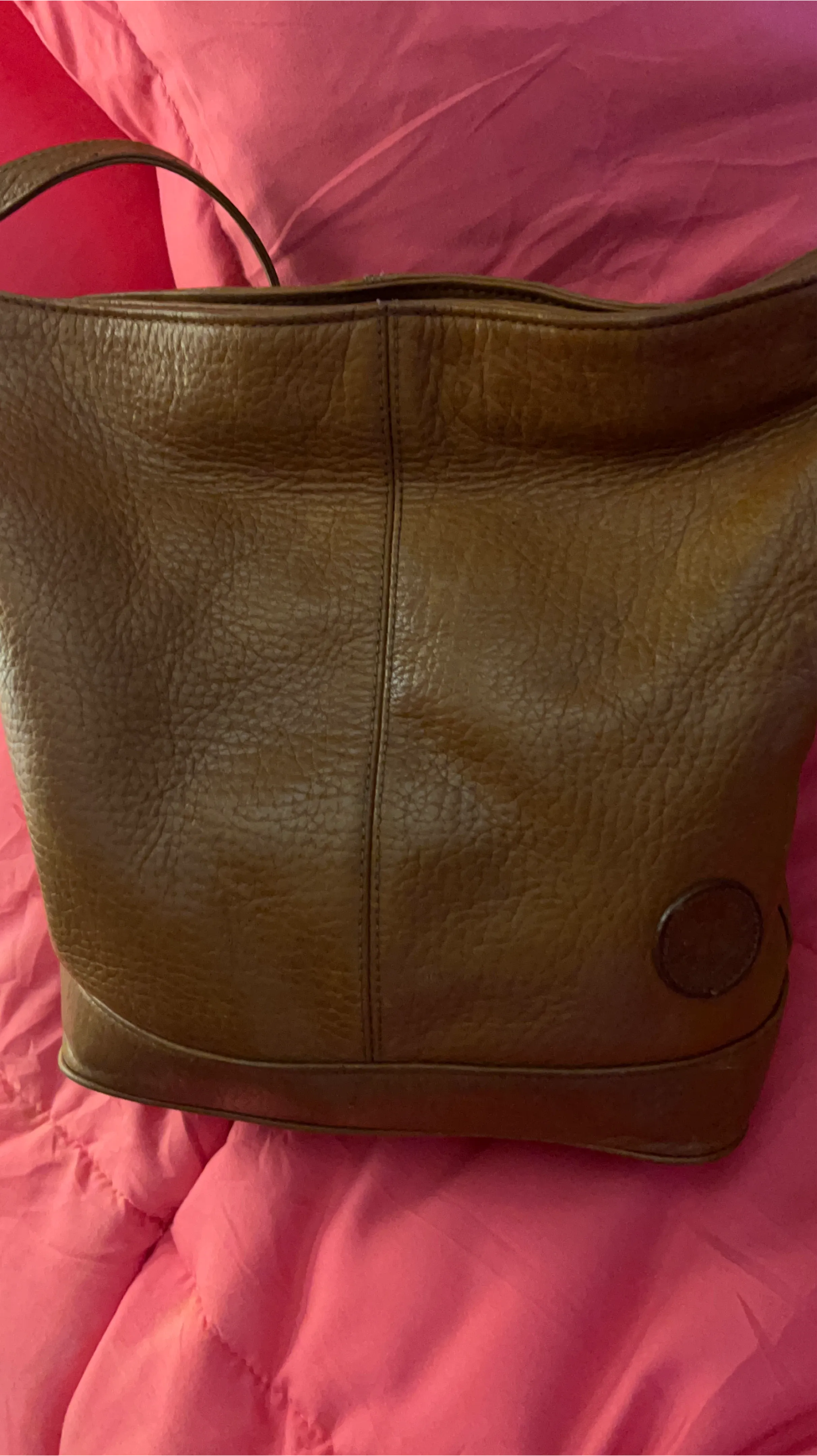 Selling a brown leather bucket bag. It's in good condition and ready for a new home! The bag has a classic design and is perfect for everyday use.
