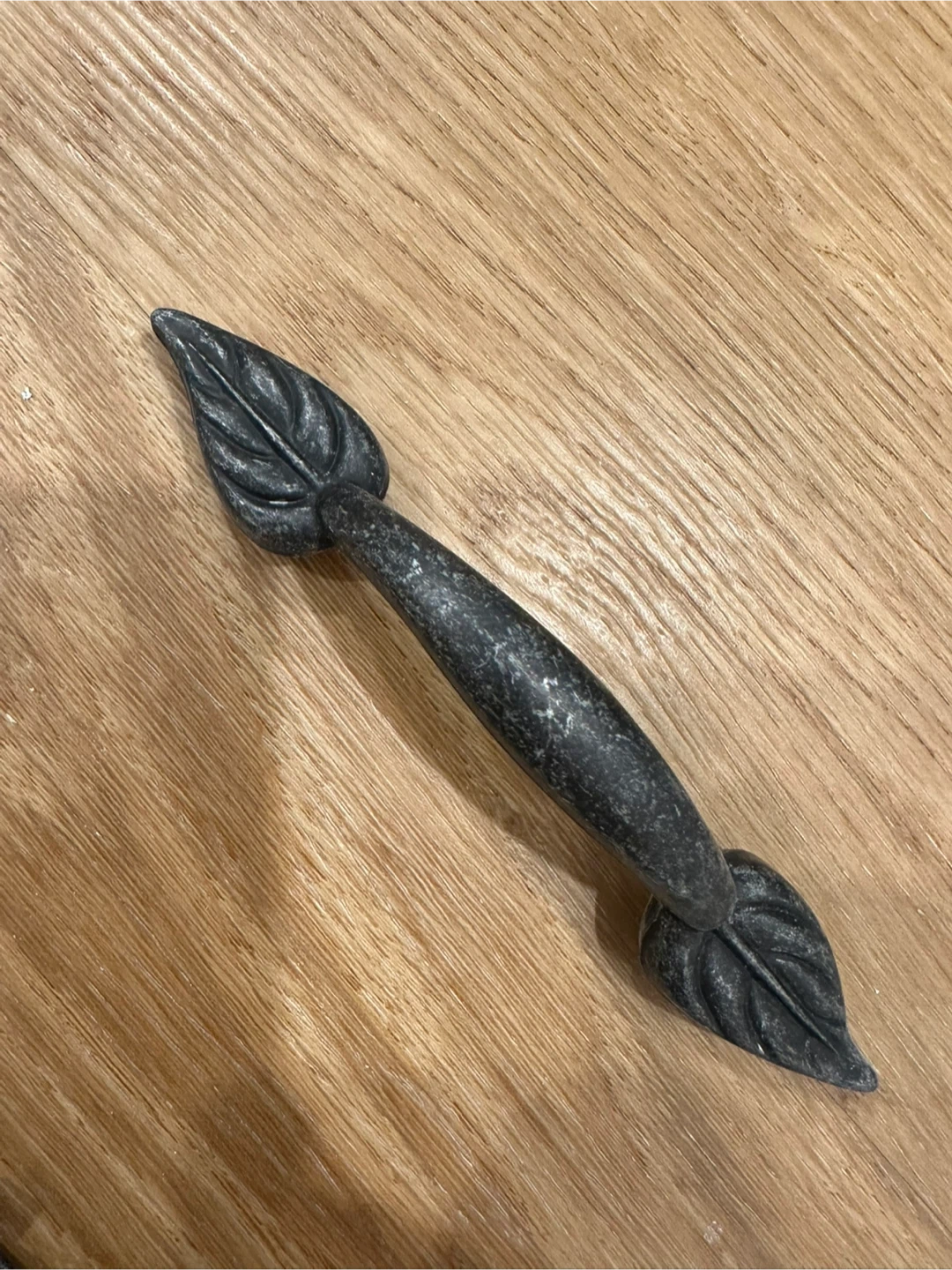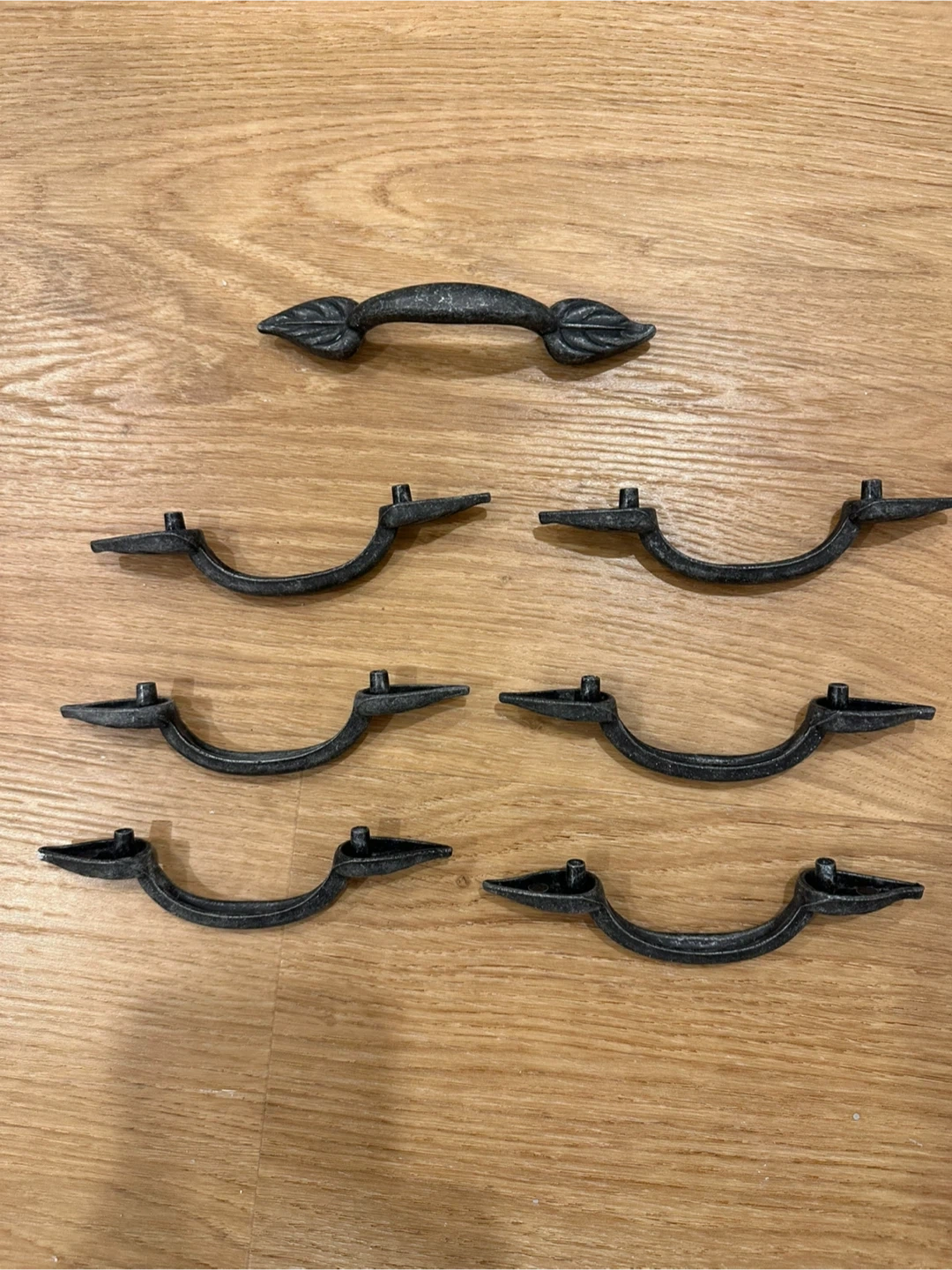 Seven antique-look drawer pulls with a leaf design on each end. Made of metal with a dark, distressed finish. Perfect for dressers, cabinets, or cupboards. Adds a rustic charm to your furniture!