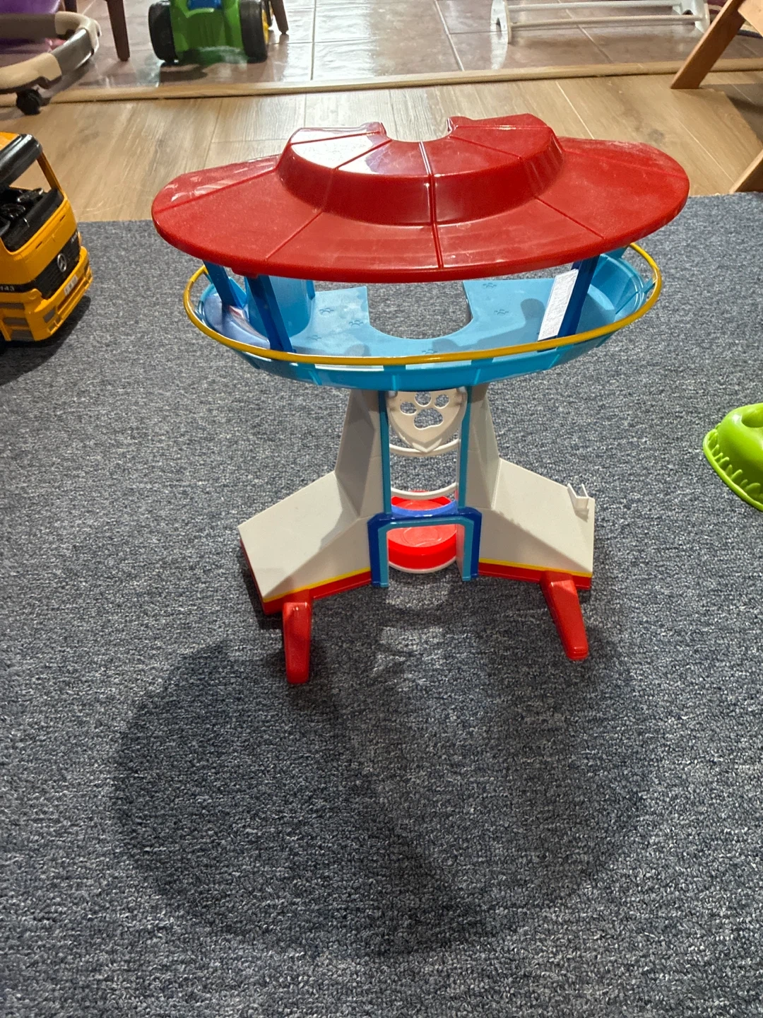 This Paw Patrol Lookout Tower is a fun addition to any playtime. It features a red top platform with blue accents and yellow trim. The tower stands on grey legs with red bottoms, complete with a white section showing a paw print.