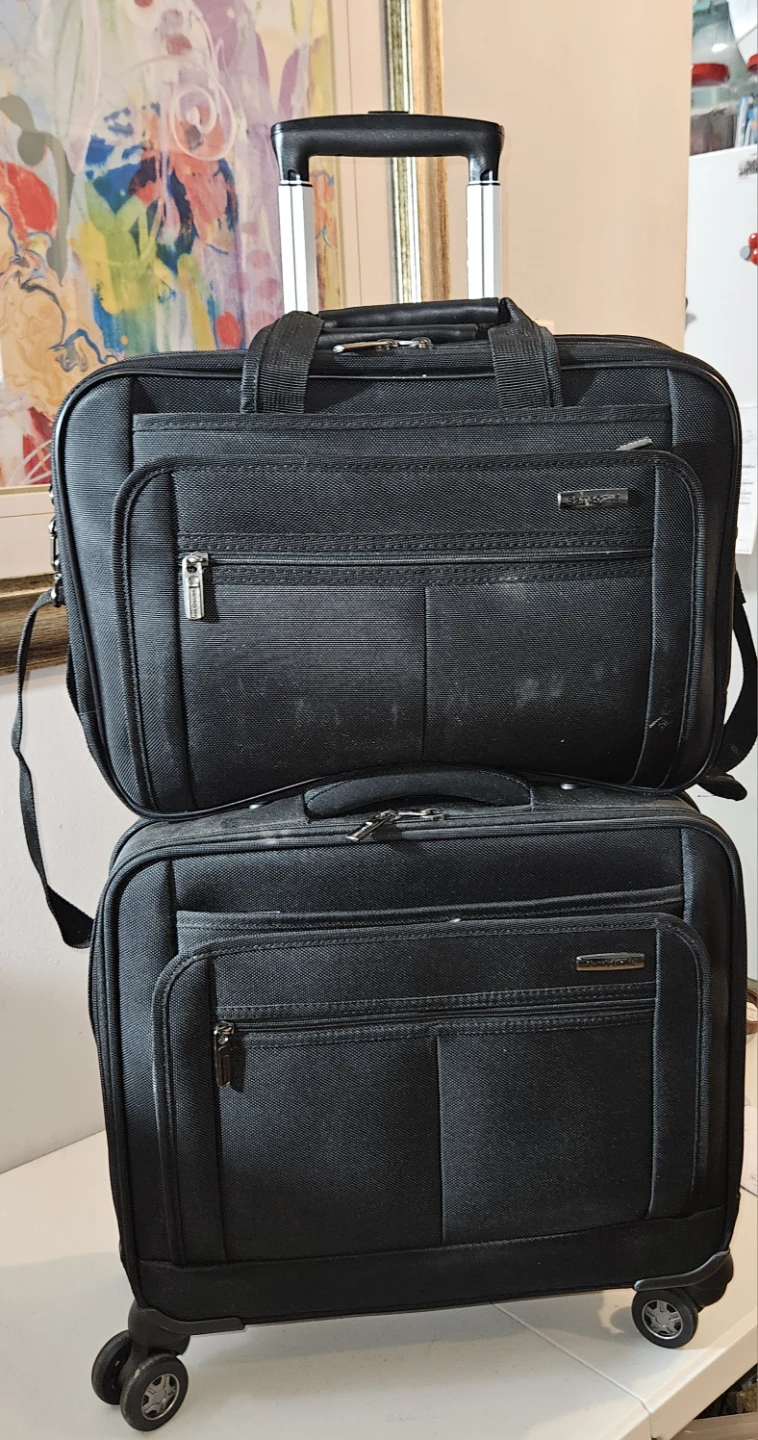Selling a Samsonite black wheeled suitcase with a matching carry-on bag. Both are in good condition and ready for your next trip!