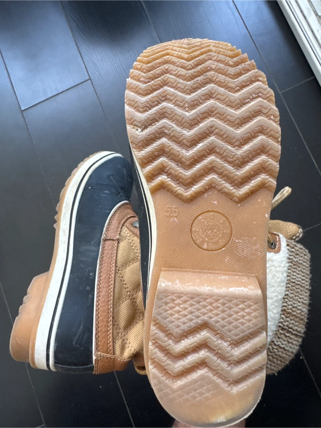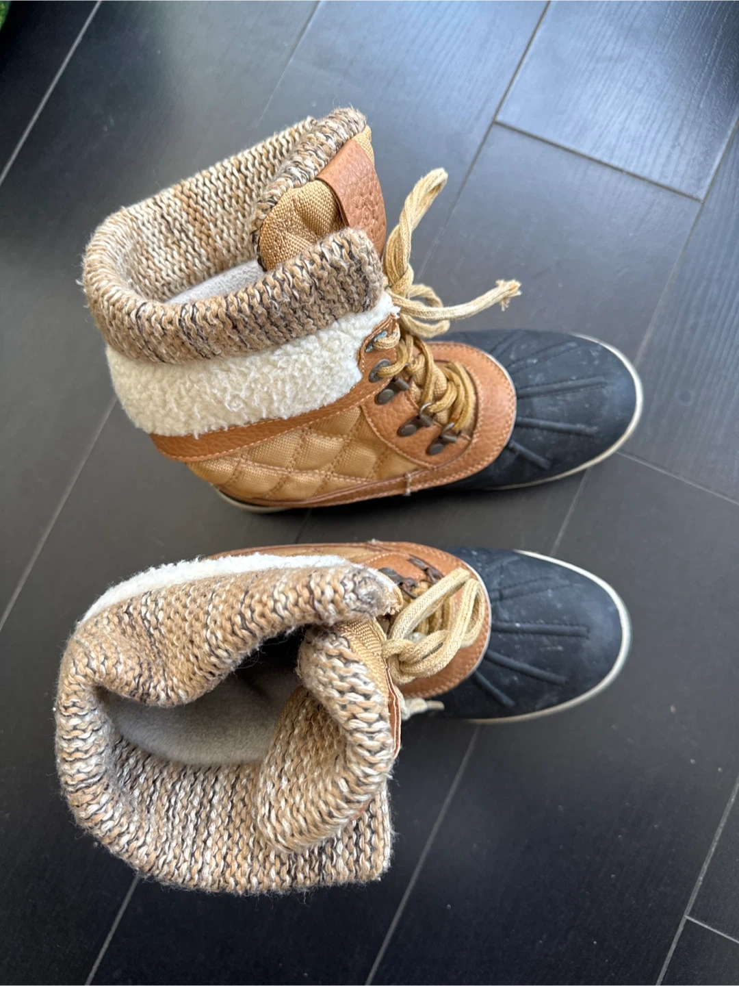 Warm winter boots featuring a quilted tan shaft and a waterproof rubber lower. They have a cozy sherpa-lined collar and a grippy sole. Size is 5.5