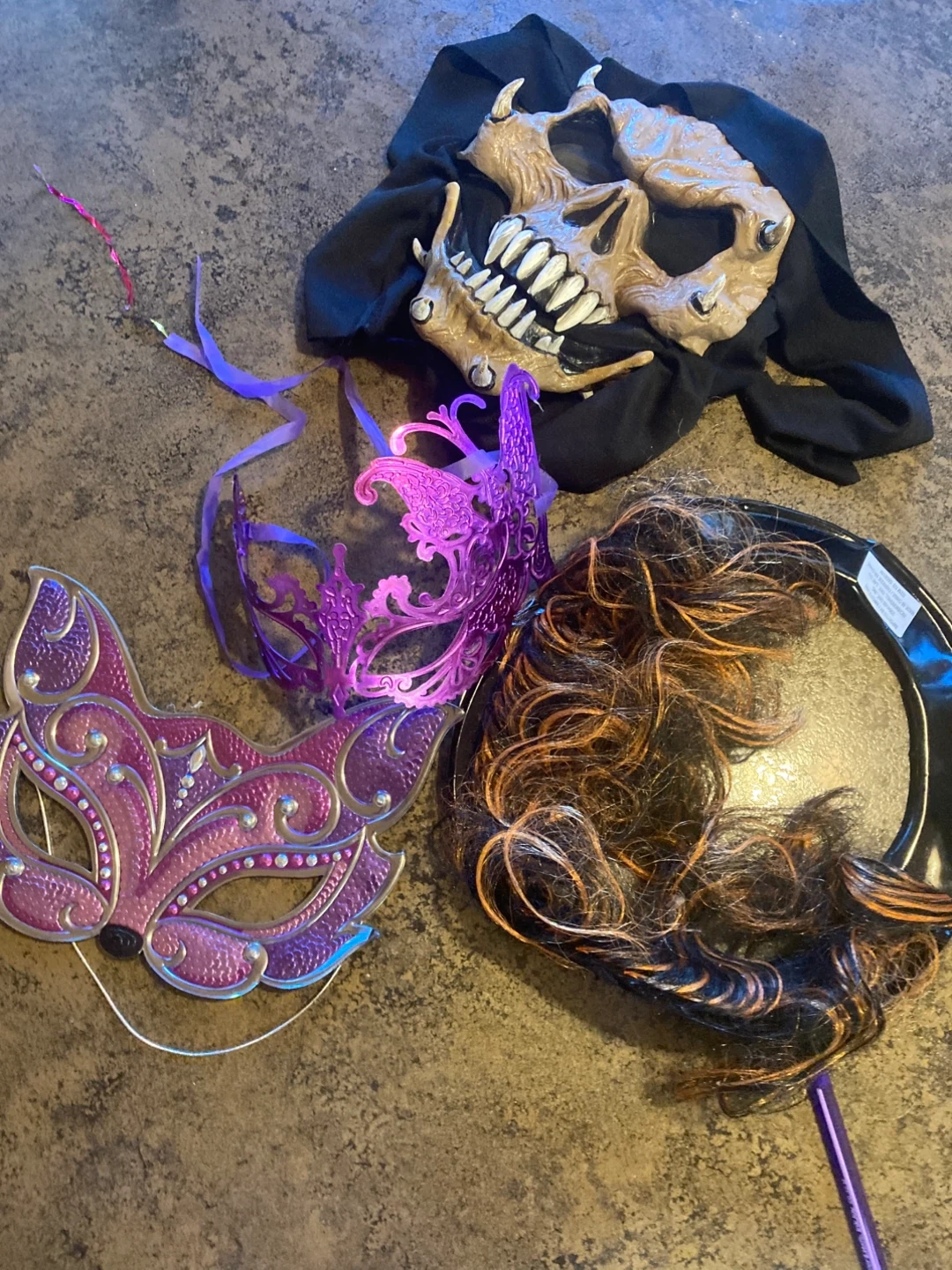 Selling a collection of assorted costume masks and a wig, like new! Includes a skull mask with a black hood, two decorative purple masks, and a black and orange wig. Great for Halloween or costume parties! All for $13 or can be sold separately.