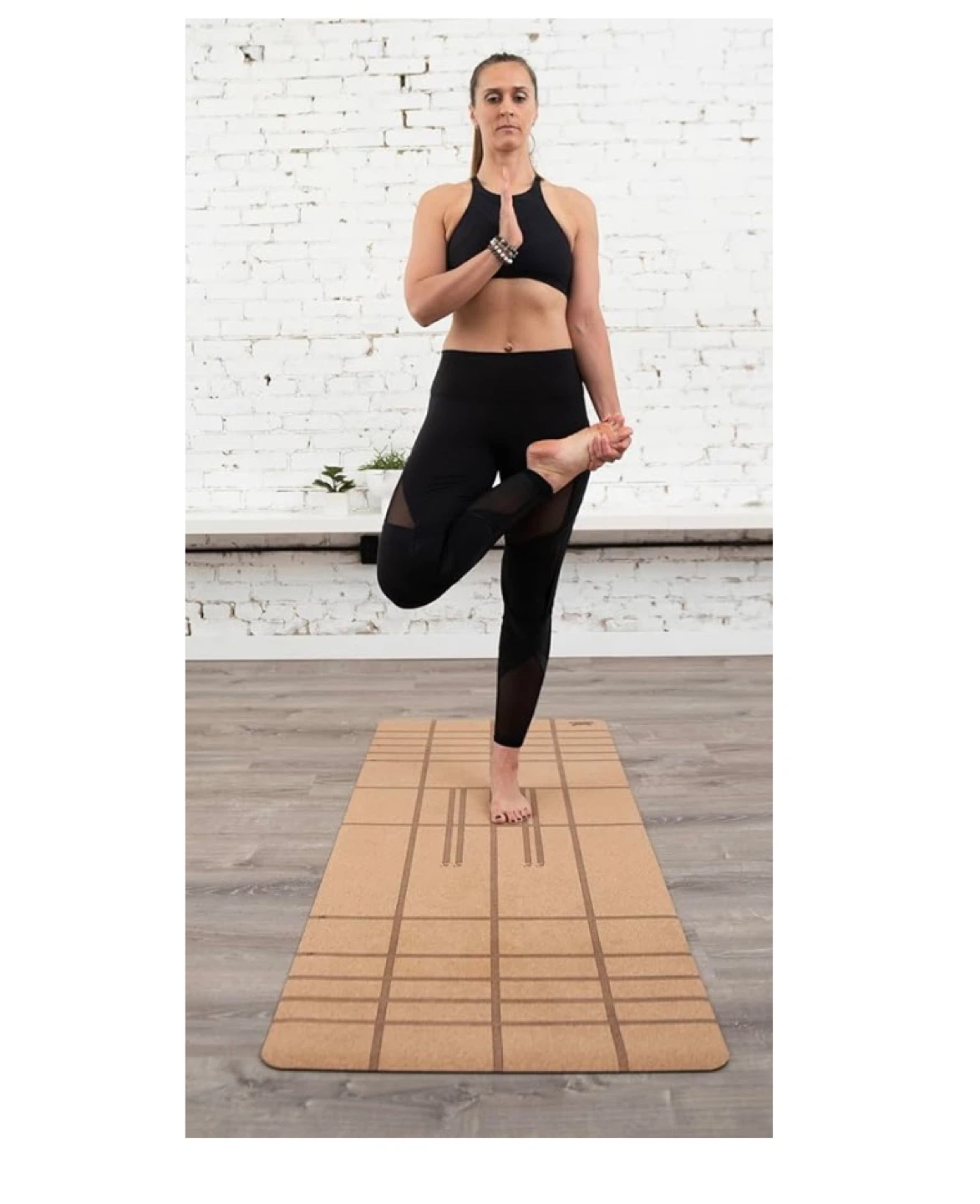 This Sweat Matterz yoga mat is made from natural cork and features an anti-slip design. It has alignment lines to help with pose positioning. Non-toxic materials.