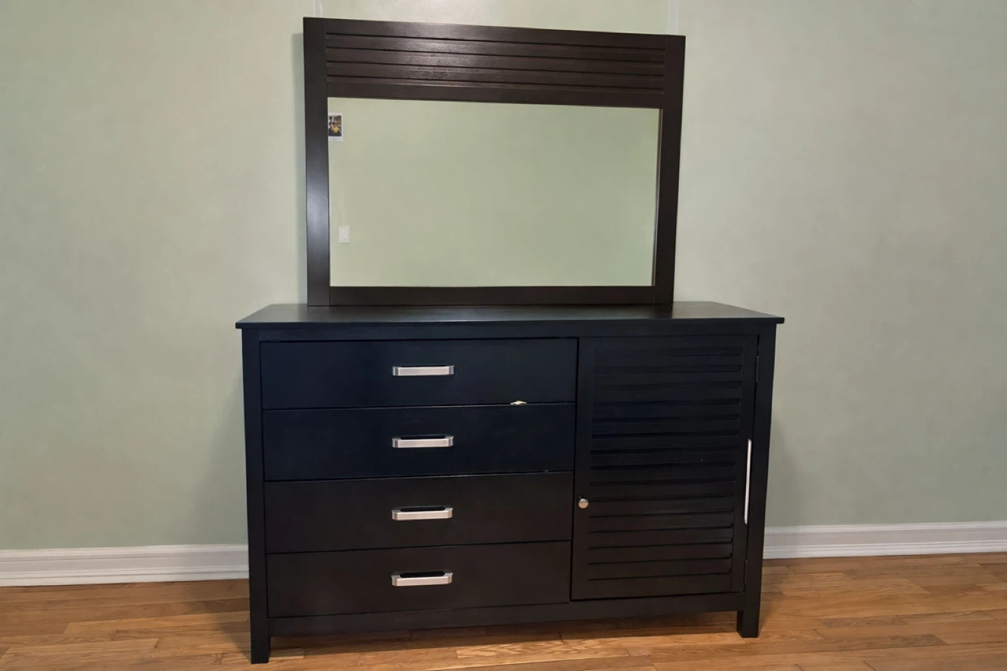 Beautiful dark wood dresser with matching mirror. The set is in good condition and offers plenty of storage with multiple drawers and cabinet space. The finish is sleek and modern, making it a great addition to any bedroom.