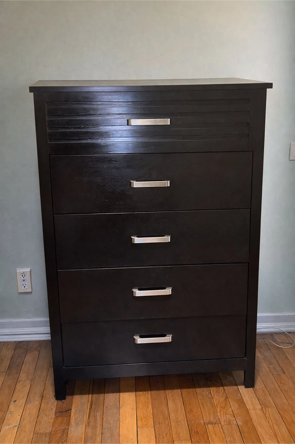 Beautiful dark wood dresser with matching mirror. The set is in good condition and offers plenty of storage with multiple drawers and cabinet space. The finish is sleek and modern, making it a great addition to any bedroom.