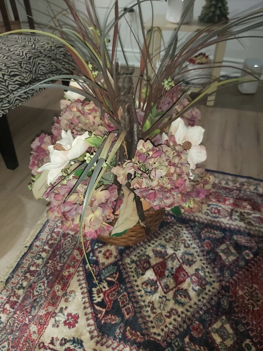 Lovely artificial floral arrangement featuring hydrangeas and lilies in a natural wicker basket. It's a beautiful decorative piece for any room.
