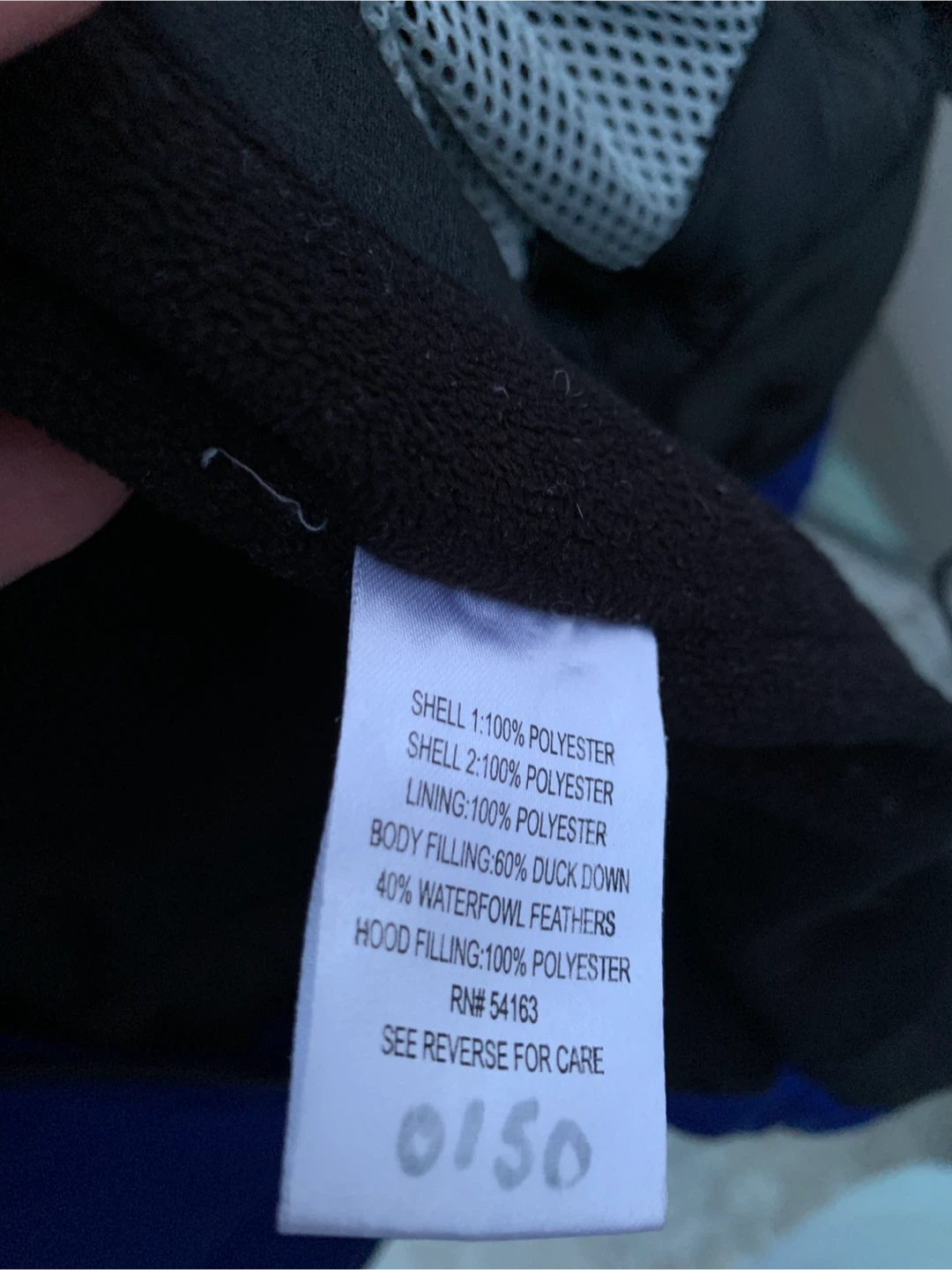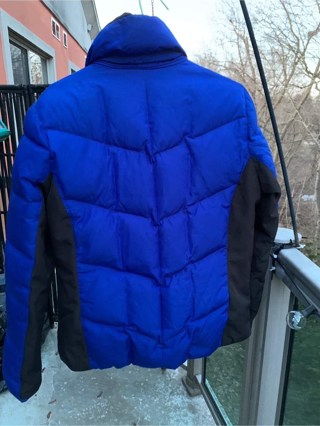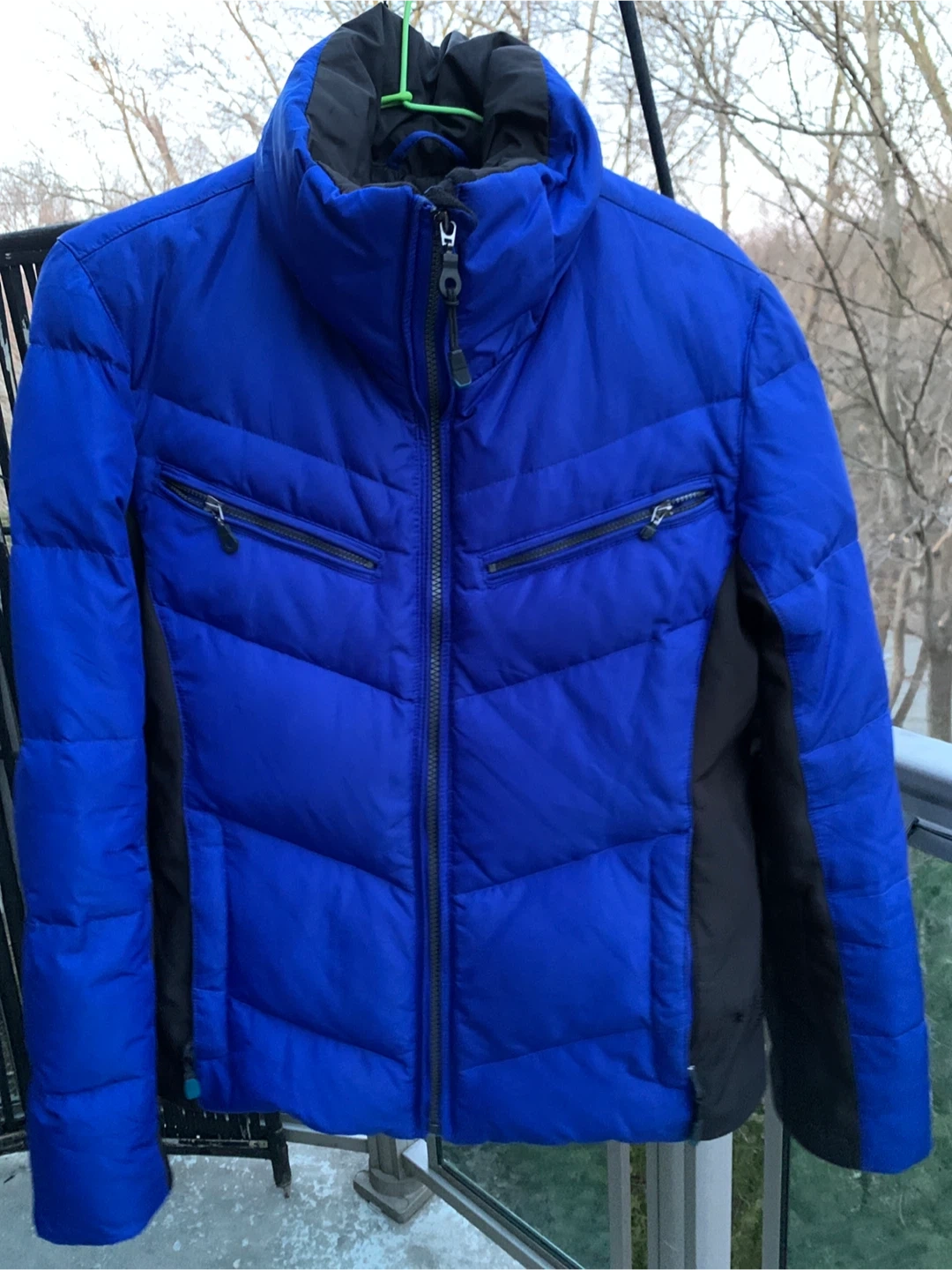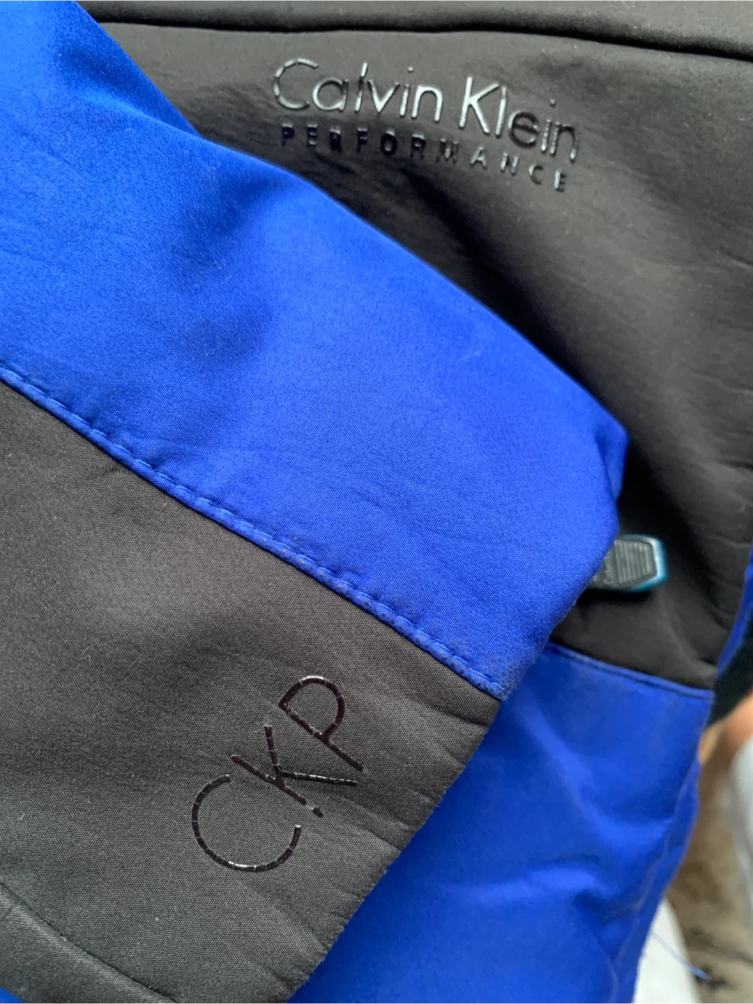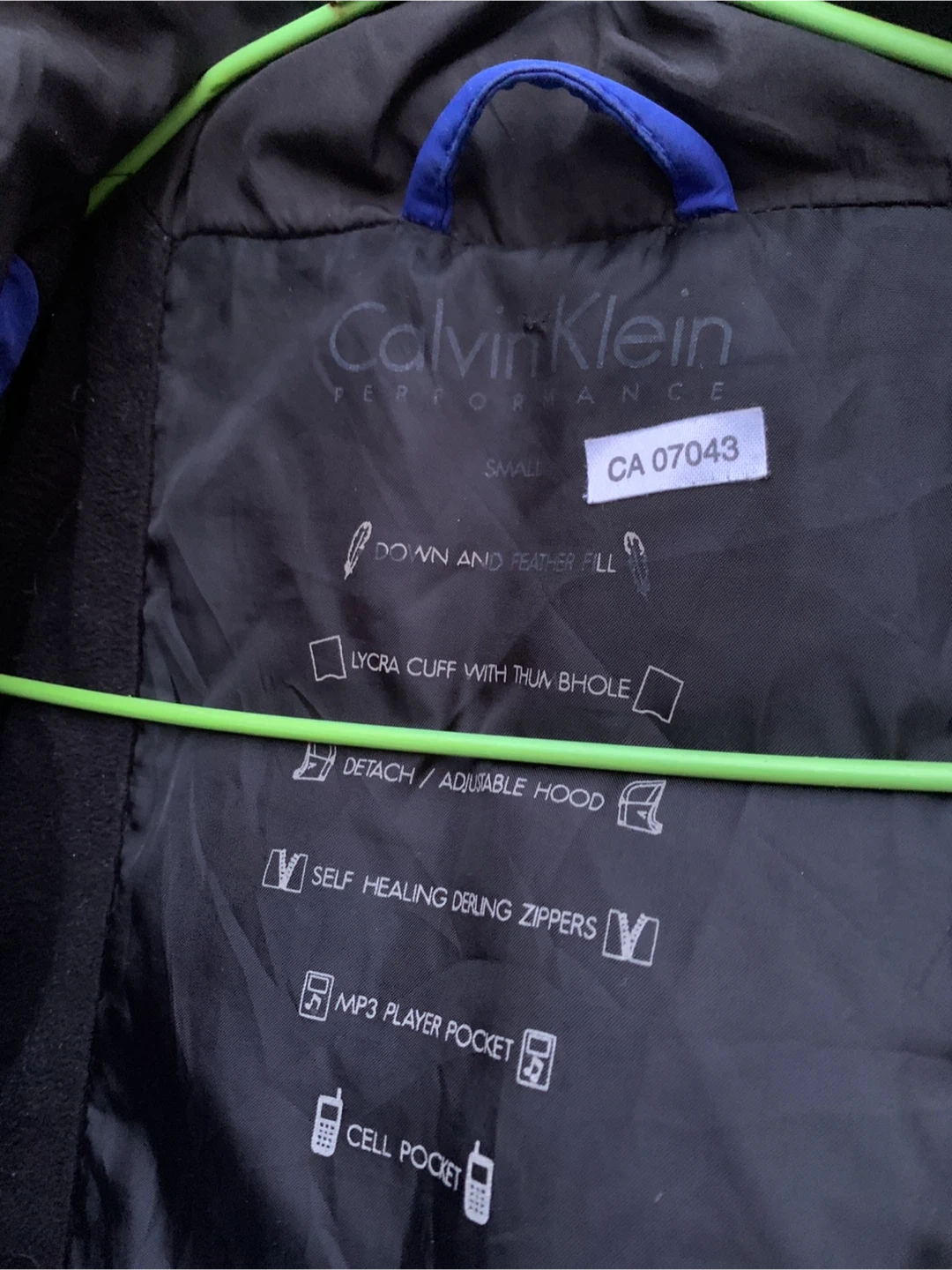 This Calvin Klein Performance jacket is a blue and black puffer style. It features down and feather fill for warmth. The jacket has lycra cuffs with thumbholes It also includes an MP3 player pocket and a cell pocket.