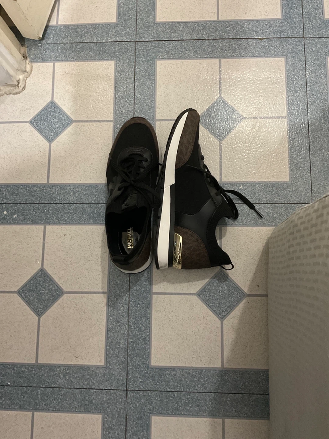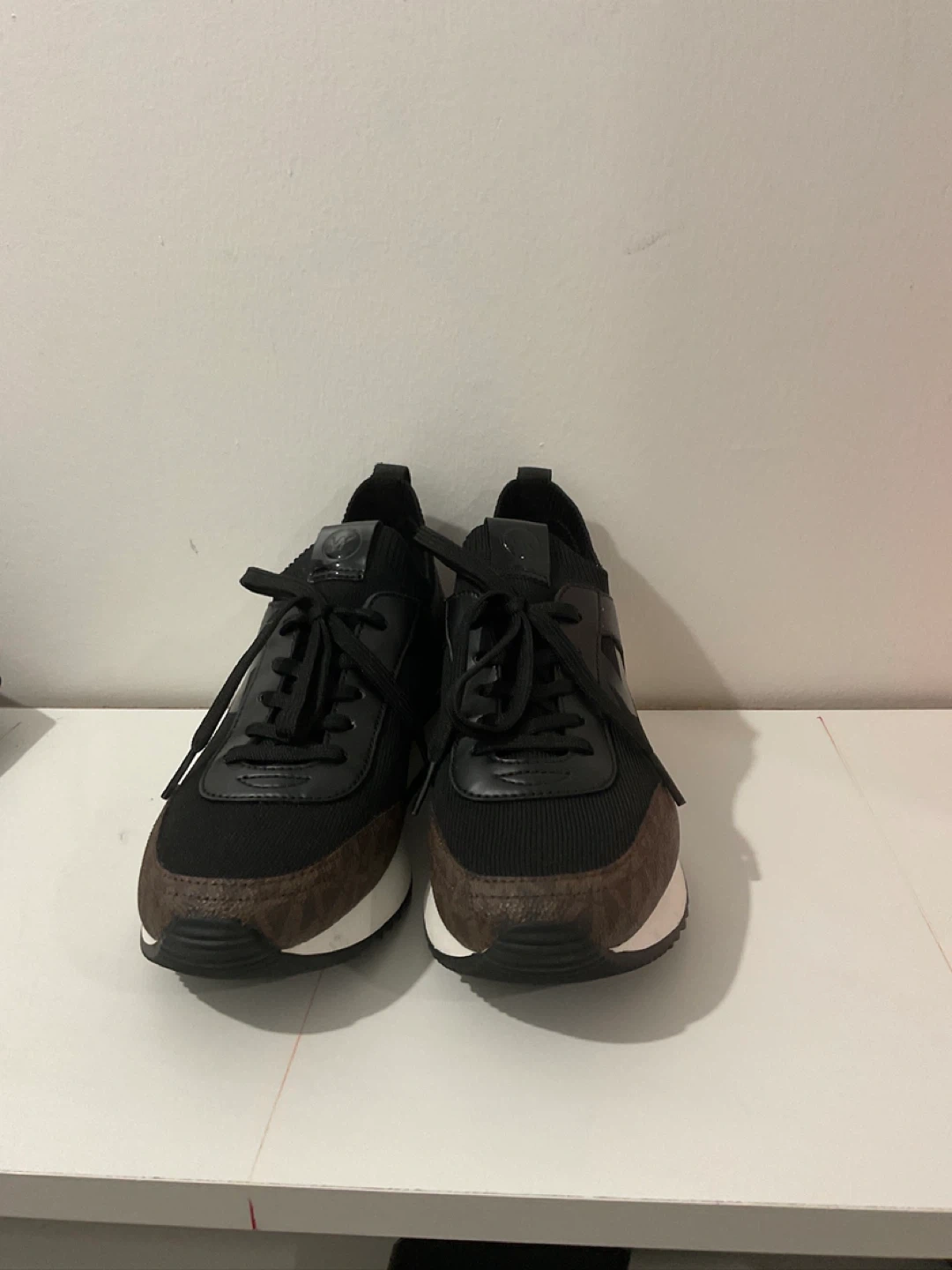 Michael Kors black knit and leather low-top sneakers with brown signature print accents. Comes with box. pickup only