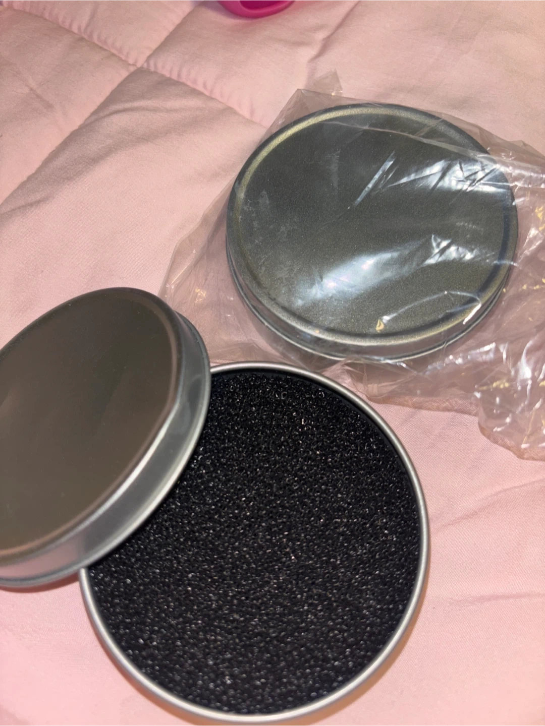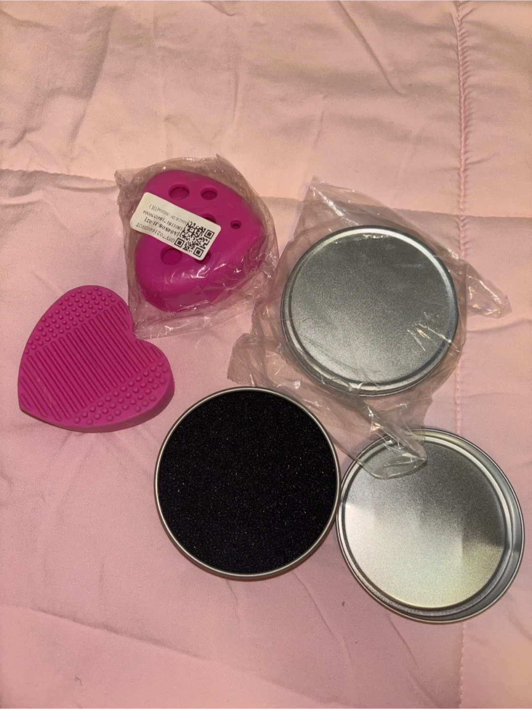 This kit includes a heart-shaped silicone brush cleaner and a round tin with a sponge for drying brushes. It's designed to help you clean your makeup brushes effectively. The tin helps keep things tidy after cleaning.