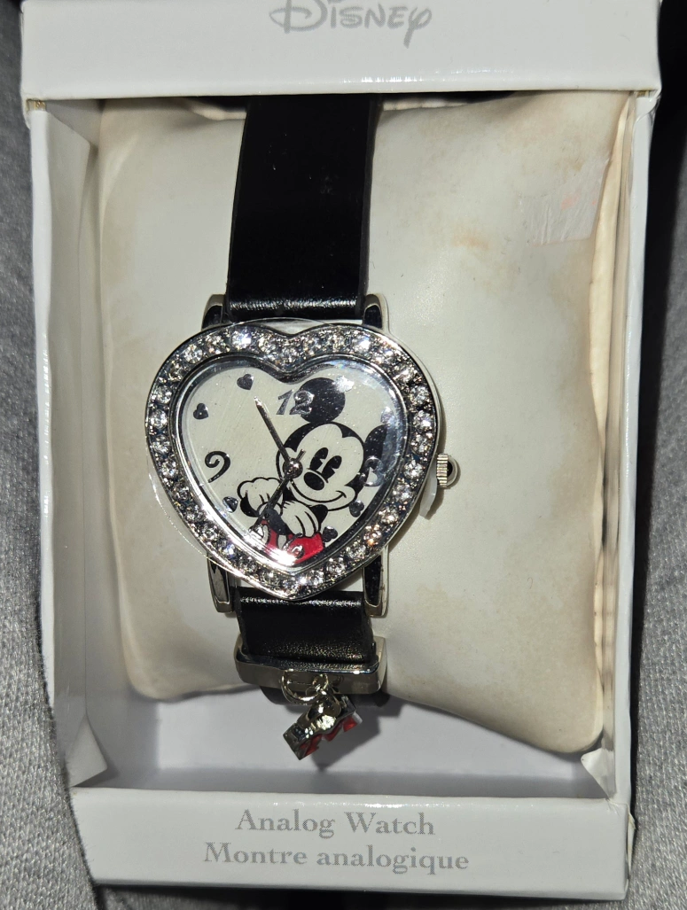 Brand new, never worn. Black leather band. Heart-shaped face with rhinestone accents. Features Mickey Mouse. Comes in original packaging.