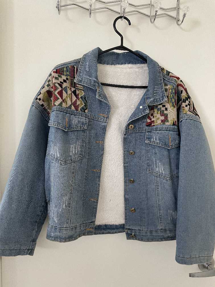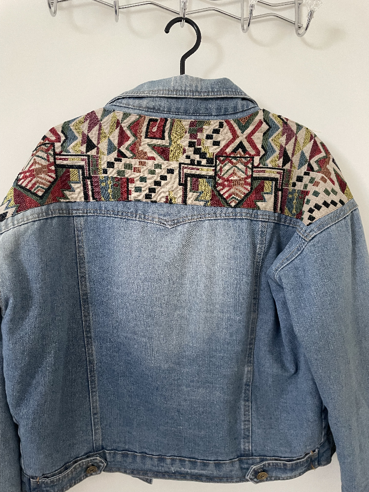 A fluff blue denim jacket with colourful embroidery on the shoulders and back.