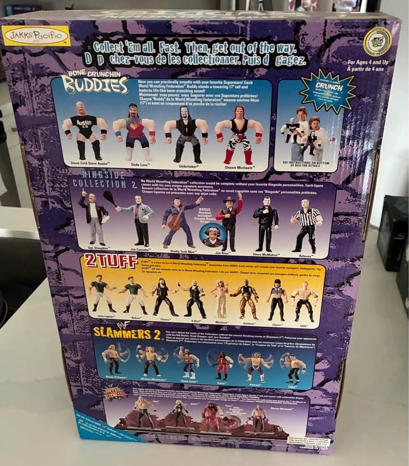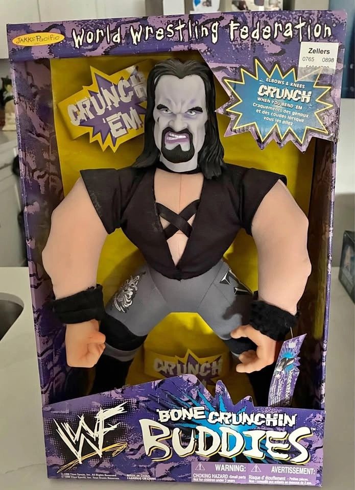 This is a 1998 JAKKS Pacific Undertaker action figure from the WWE franchise, part of the Bone Crunchin’ Buddies series. The figure is boxed and features an oversized design with adjustable parts, made of plush and plastic. It stands 16 inches tall and is a 1:4 scale replica. A great vintage item for wrestling fans, collectors, and kids alike.