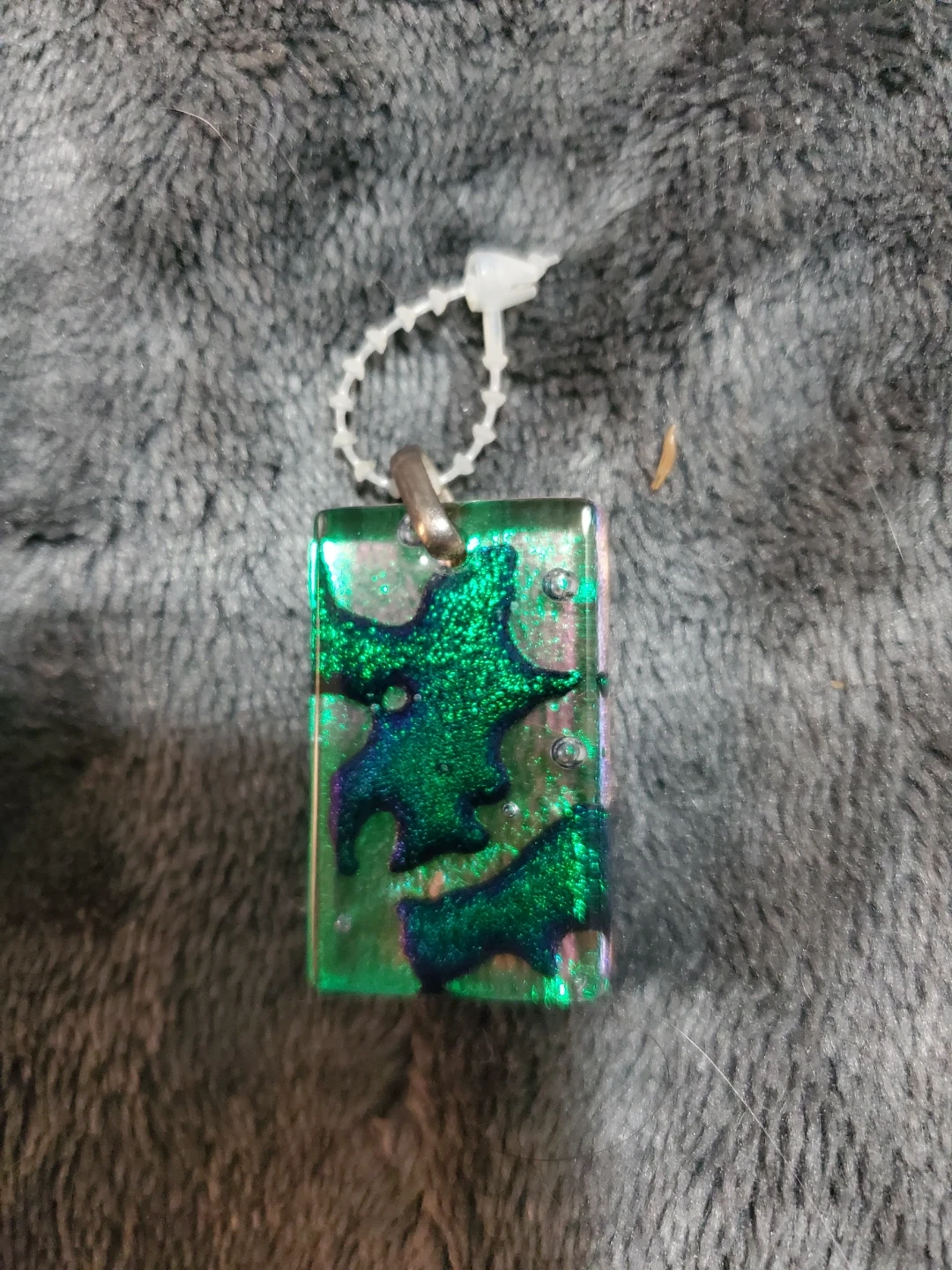 Rectangular pendant with a green sparkly background and a black bat silhouette. It's handmade. This pendant could be worn for Halloween or as a unique accessory. Cedar area pick.