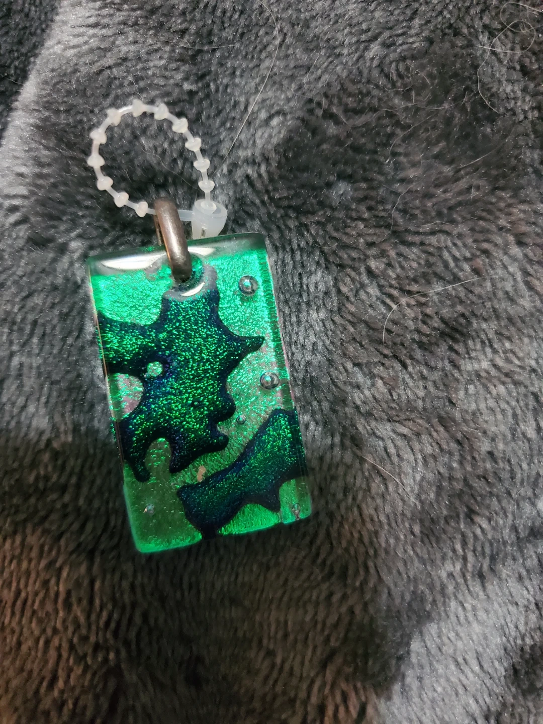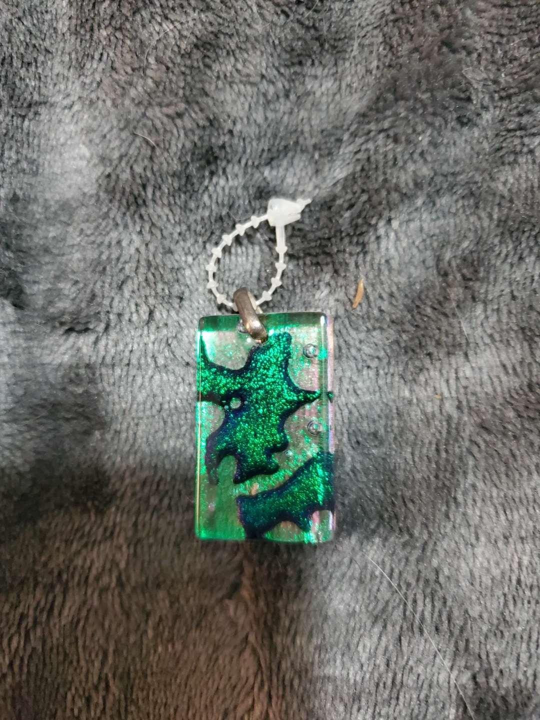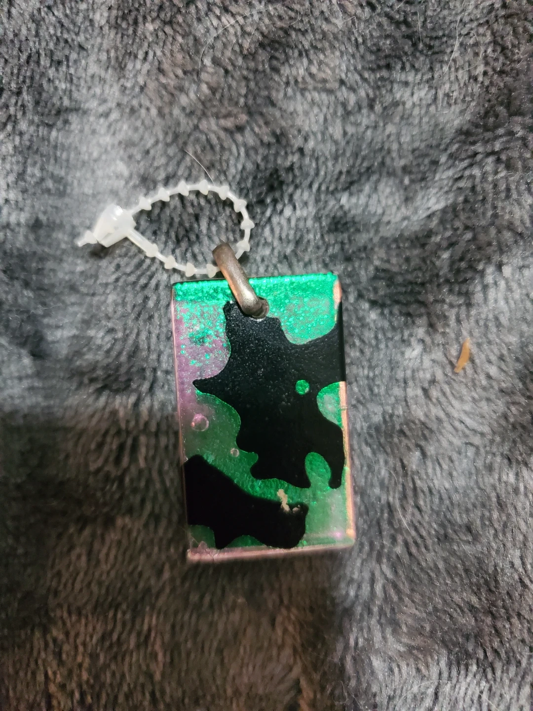 Rectangular pendant with a green sparkly background and a black bat silhouette. It's handmade. This pendant could be worn for Halloween or as a unique accessory. Cedar area pick.