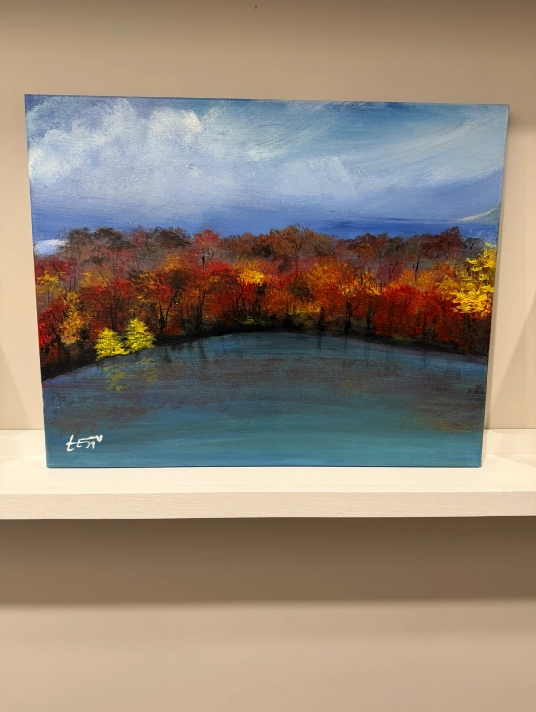 A beautiful acrylic painting depicting an autumn landscape with vibrant fall foliage by a serene lake on 16”x20” canvas back stapled to wood frame.