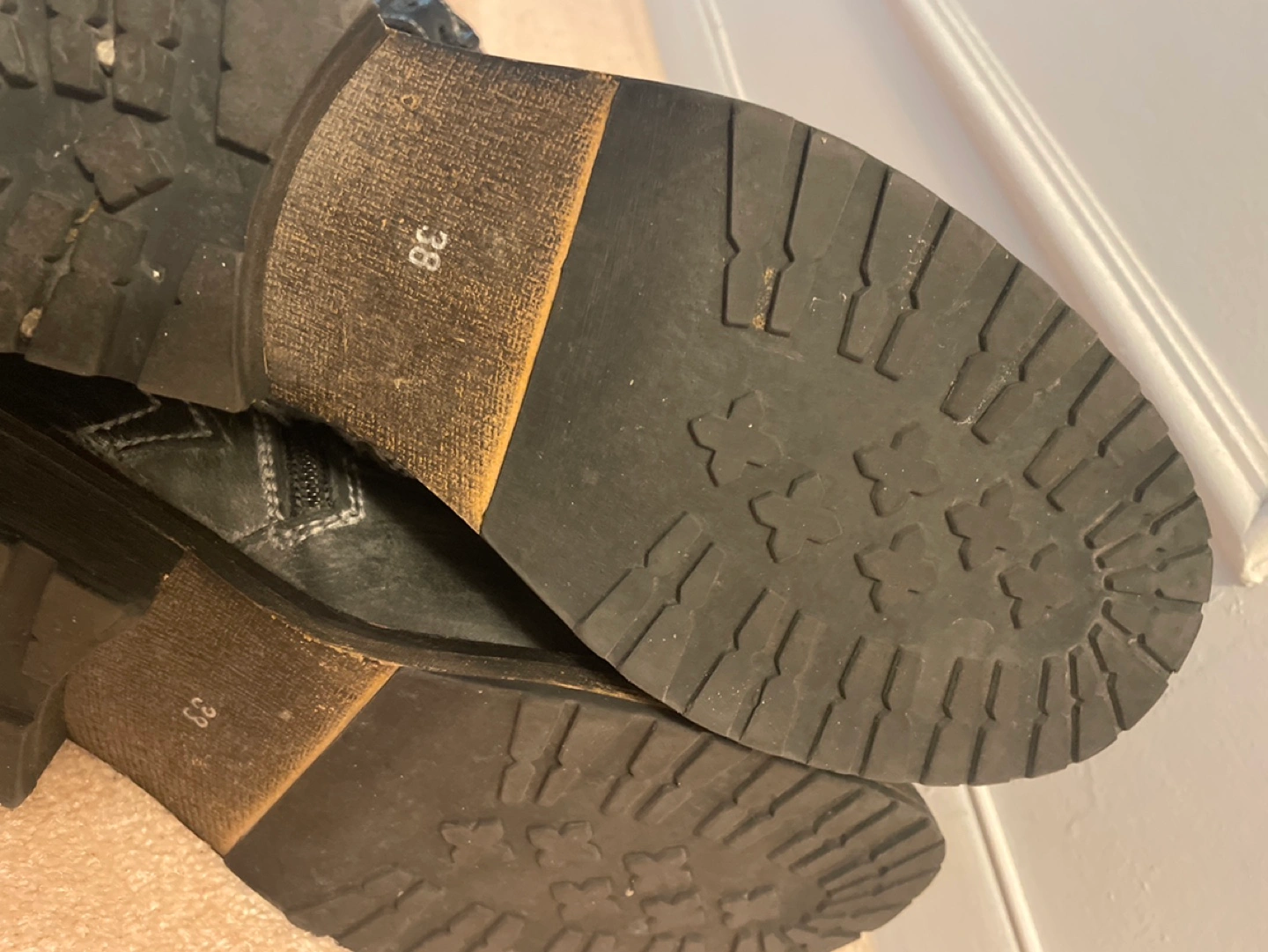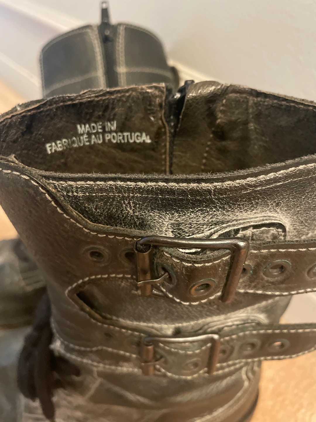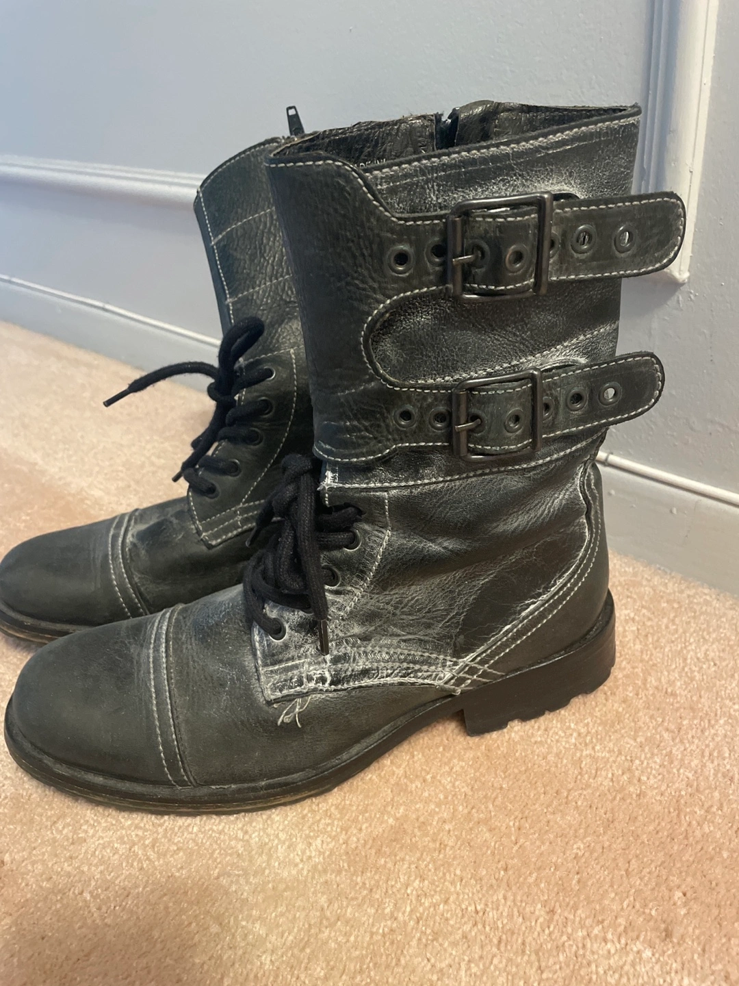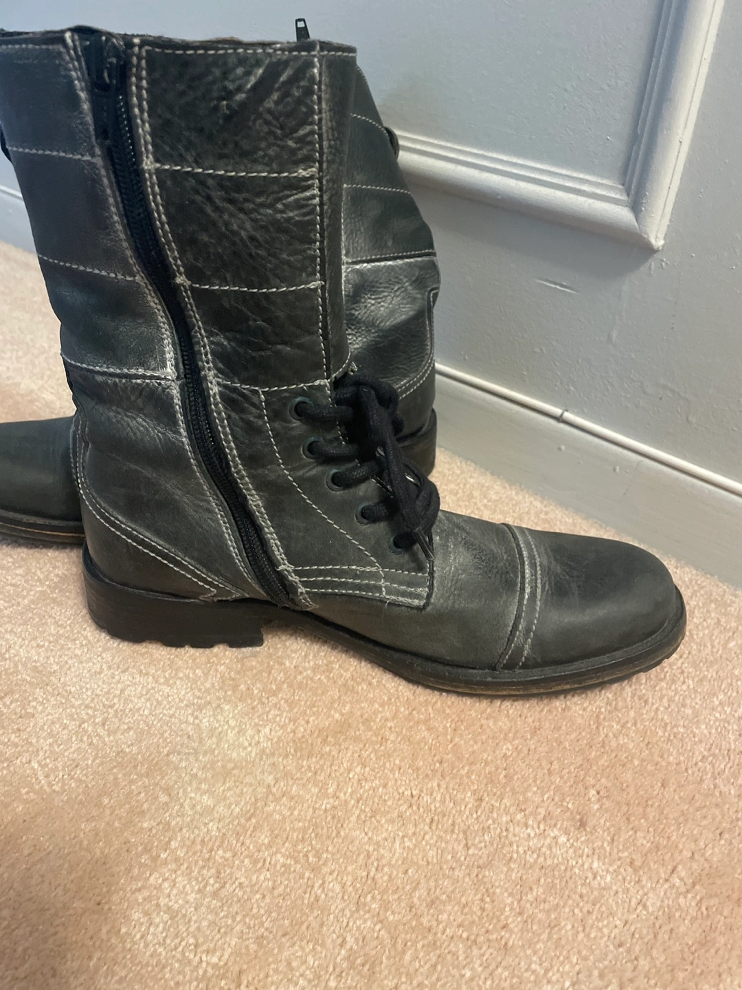 Dark Grey distressed leather combat style boots. Laces and side zipper