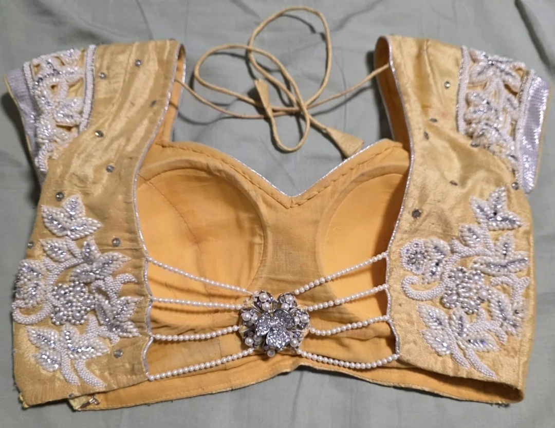 Blouse: Stylish modern designer back with a broach and pearl work all over and sleeves.