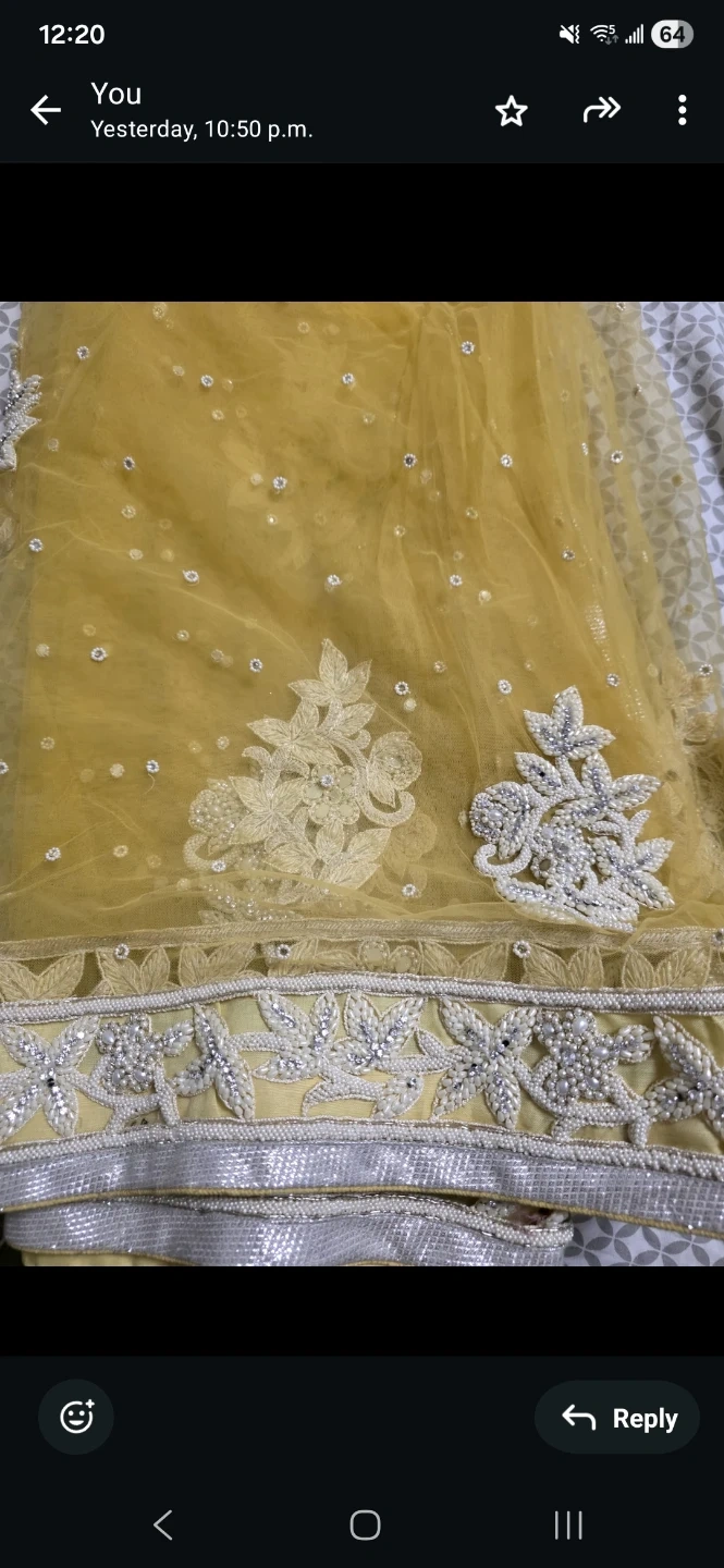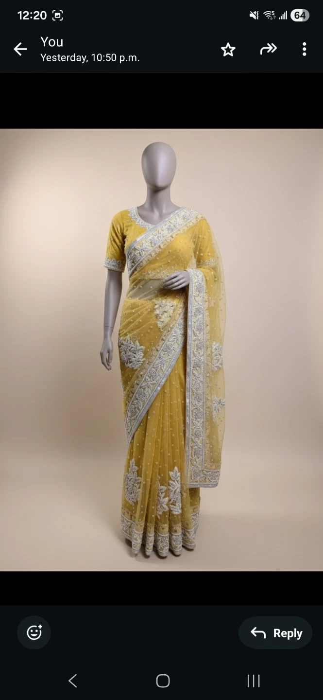 Beautiful yellow saree featuring intricate silver beadwork and embroidery. It comes with a matching embellished blouse. Perfect for special occasions!