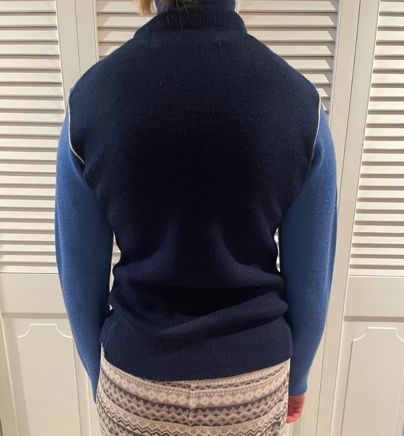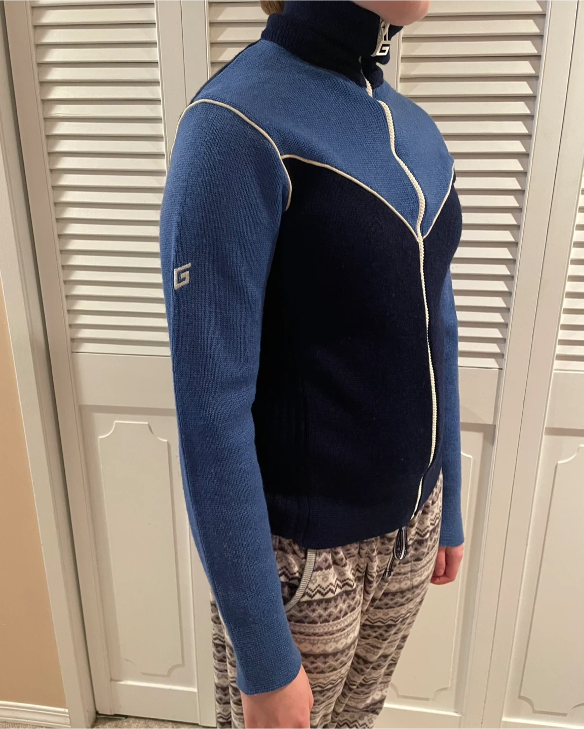 Vintage Wool Ladies sporty GORDINI zip-up sweater with a turtleneck collar. It's dark navy and royal blue with contrasting cream piping. Material is 100% wool. Great vintage shape!