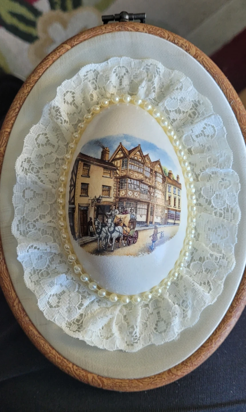 This is a decorative oval egg featuring a charming scene of a horse-drawn carriage and historic building in England. It's embellished with delicate white lace and pearls. This piece would add a lovely touch to any home. It's great for display or as a unique gift!