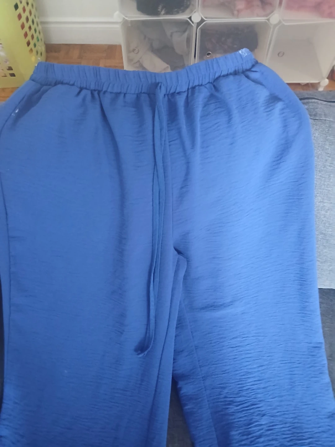 These blue wide leg pants have a textured fabric and a drawstring waist. Elastic waistband for comfort.