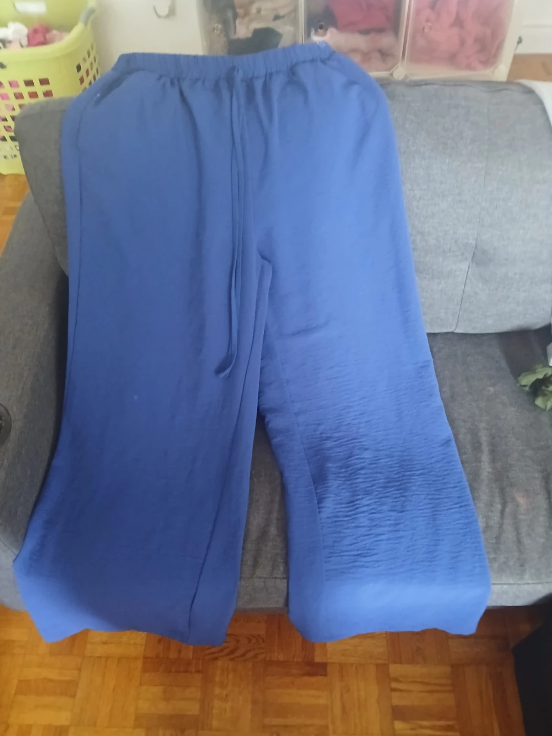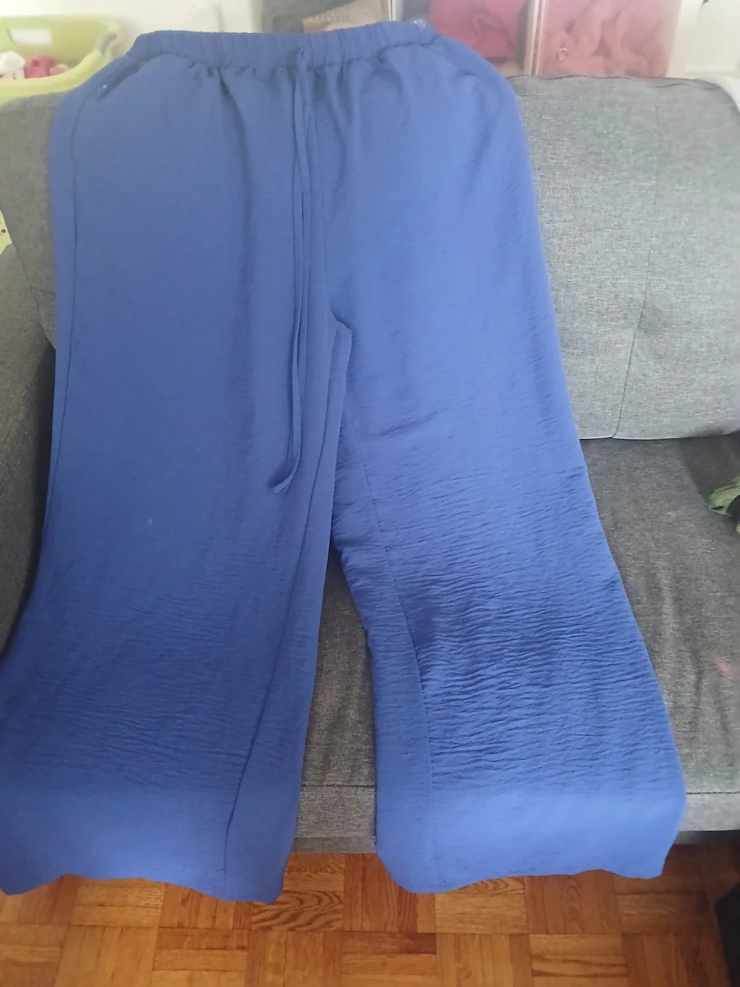 These blue wide leg pants have a textured fabric and a drawstring waist. Elastic waistband for comfort.