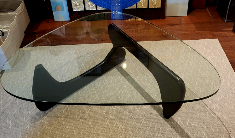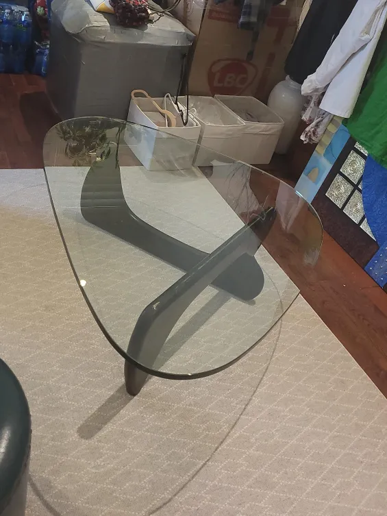 Selling a stylish glass coffee table featuring a unique dark mocha wood base. It's in good shape and would make a lovely addition to any living room in a house or cottage.